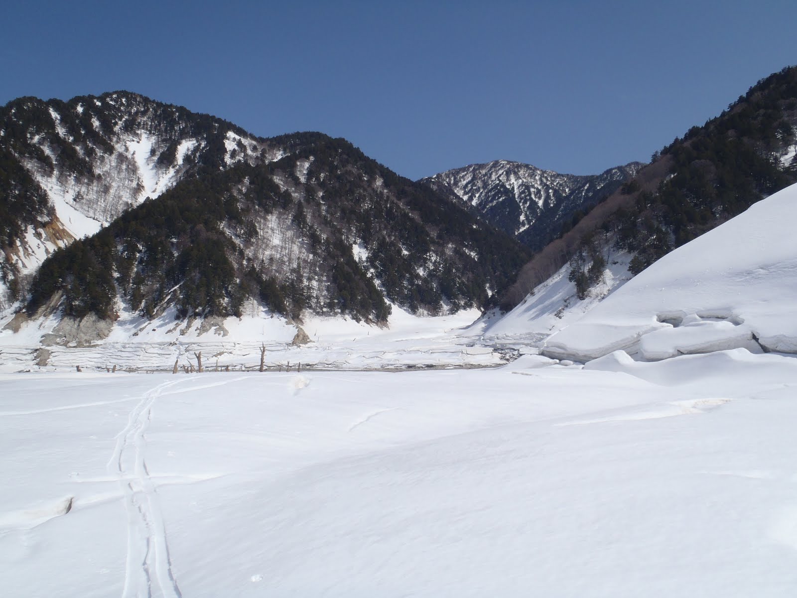 ・谷の下部では全層雪崩に伴う巨大デブリを散見。斜面にもクラック多数。GWの頃には賞味期限切れか?