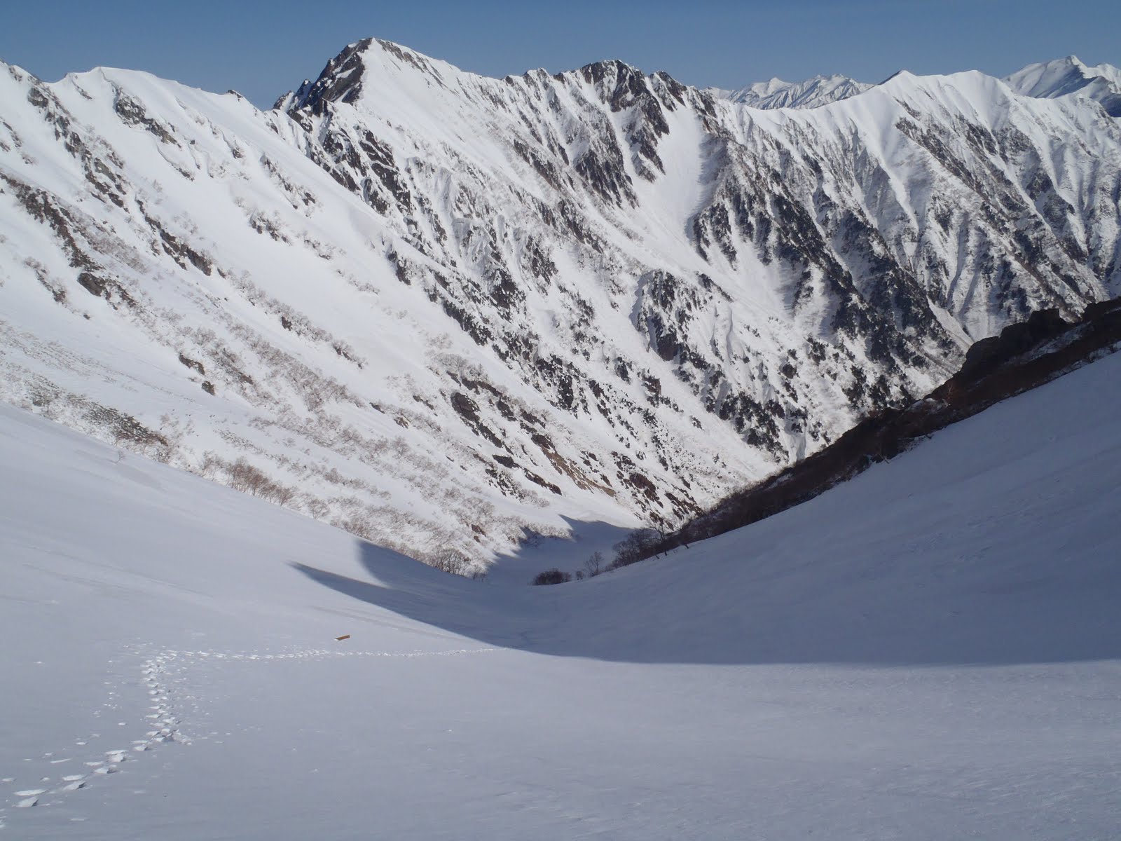 最初はカリカリ斜面だったため、大事を取って標高差150m位アイゼン下降すると雪も若干緩んできた。ハイマツの生えた小さな尾根上でスキーを履き滑降開始。傾斜は35°位だがルンゼ状で幅は広くないので慎重に高度を落とす。降りるに従い雪はどんどん緩くなり、緊張しなくても滑れるようになってきた。