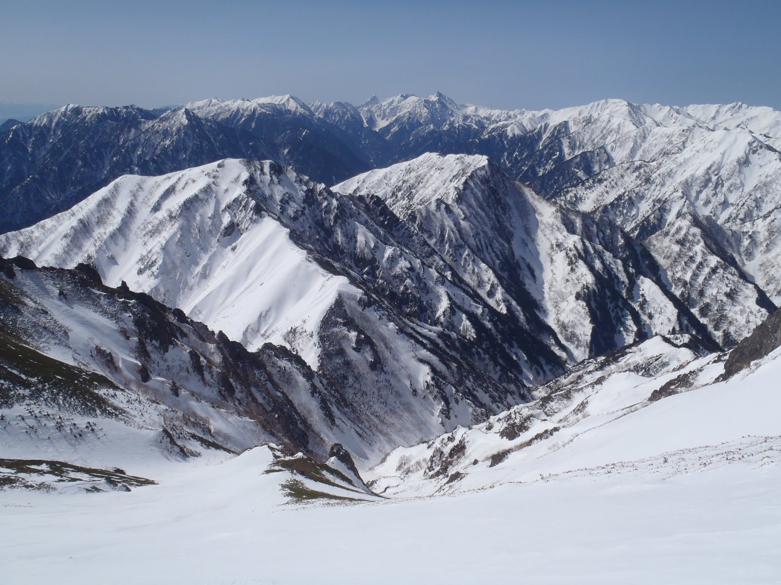 前日朝までの新雪が10㎝弱積もっているが雪質は安定しており、先週に引き続き安心して登行する。針ノ木峠手前で一か所氷化している斜面があり、シートラーゲンに切り替えて峠まで登る。峠からは南は槍・穂高、北は鹿島槍まで見渡せ、とてもいい気分だ。