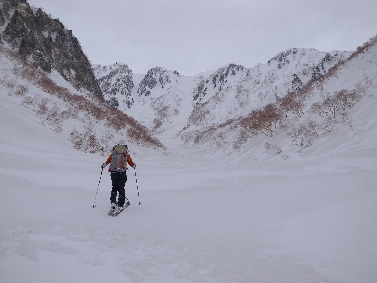 やや時間が押していたが、ルーファイで迷うこともなく快適に滑走、明るい内に槍沢出合に到着。
