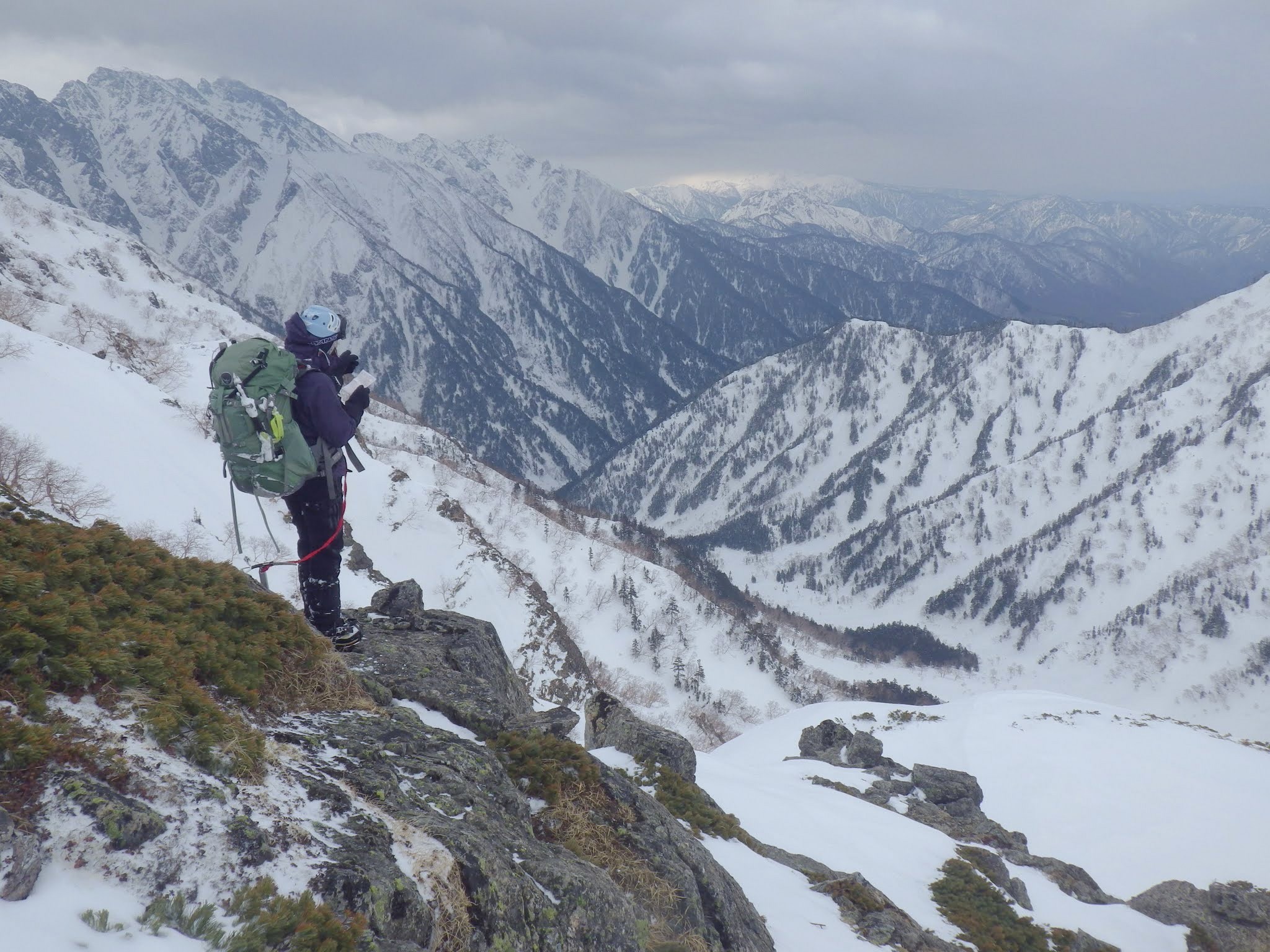 大喰岳西尾根中腹で、下山しながらスタンディングアックスビレイの練習をする。2本のスノーバーで流動分散して支点を作り、メインロープでバックアップ(セルフ)を取り、肩がらみでビレイ、というのを実施。降りるときにも使うんだなー、と何か目からウロコ。やっぱりいろいろなシチュエーションで繰り返し試すと発見がある。