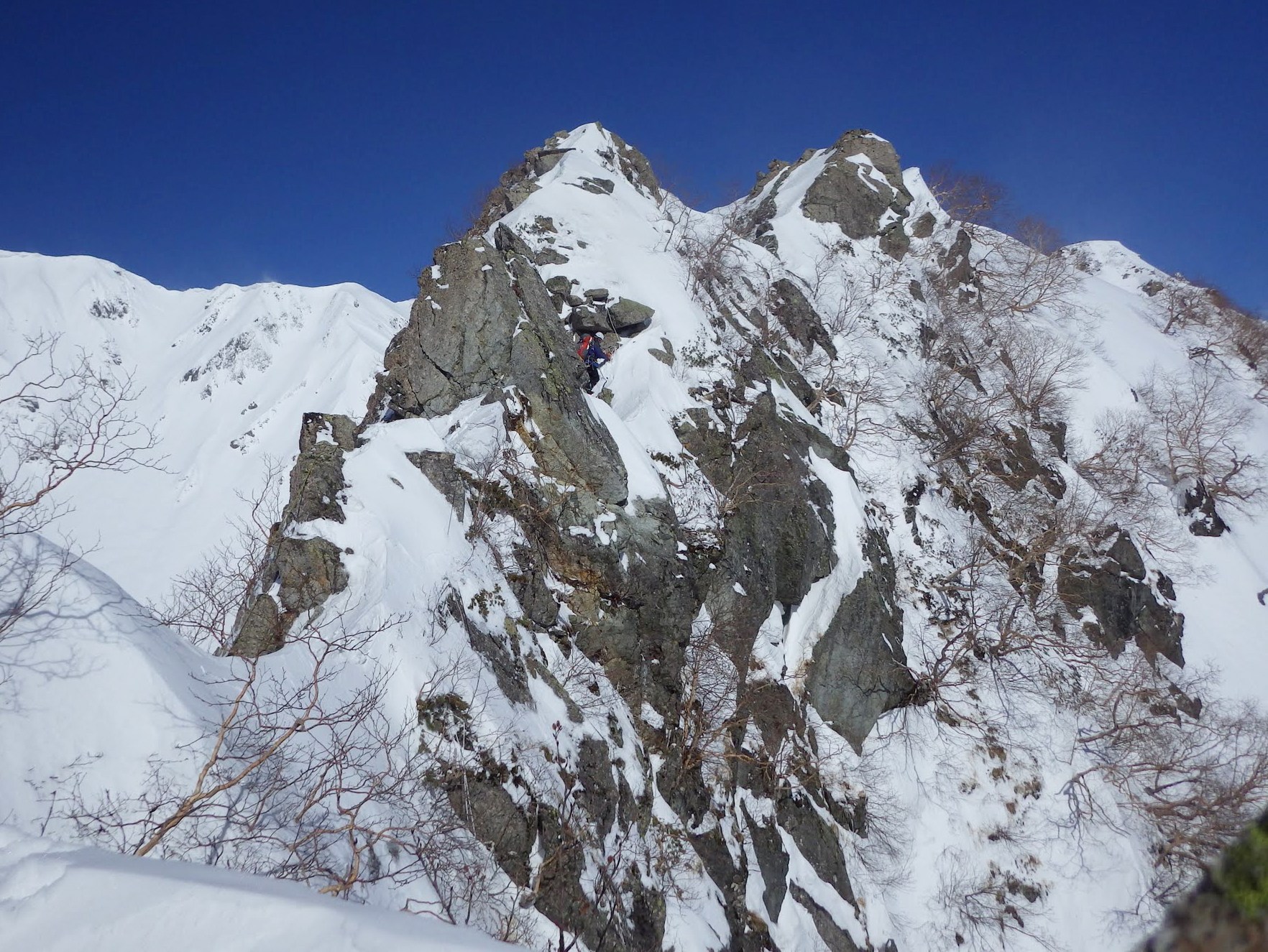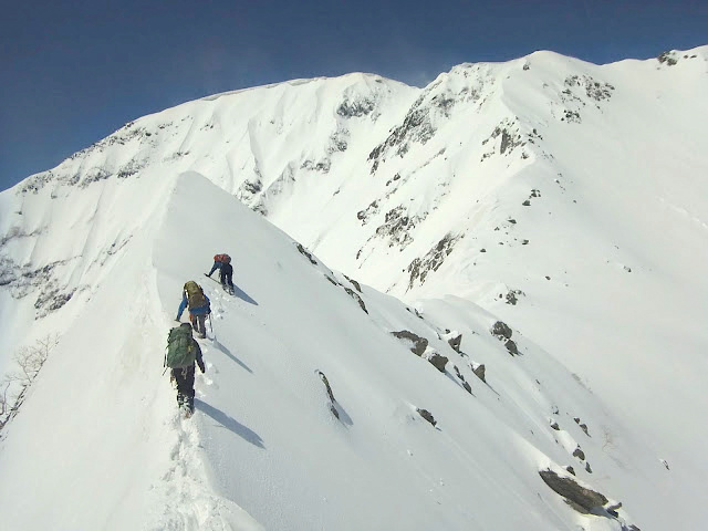 雪庇に注意して、誰のトレースもない雪面を先に進みます。昨日までのラッセルに比べれば深くないものの、それでも時に膝下まで足が入るため、すぐに息が苦しくなります。この辺りでは、H光LとN野さんが、力を発揮してくれました。やがて、主稜線にかかっていた朝靄もすっかり上がり、雲一つない晴天となりました。