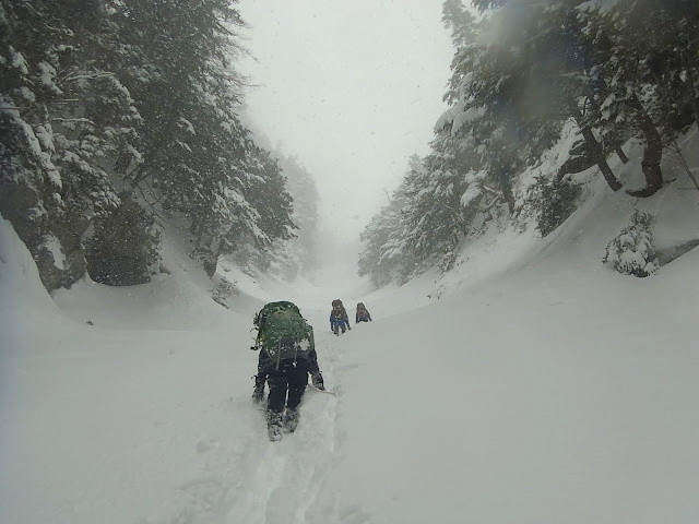 10:50 雪崩に気をつけながら、沢の端を登っていく。雪はいまだ降り続いており、とても深い。