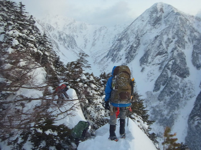 7:00C2ー7:45大喰岳西尾根中腹で雪訓8:30ー10:00槍平ー11:00滝谷出合ー12:30白出沢出合ー13:30穂高平避難小屋ー14:30新穂高温泉