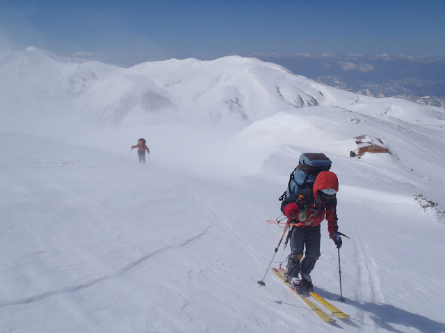 単独のK池さん、M谷さんと一緒に入山。北ノ俣岳避難小屋からはホワイトアウト気味の中をスネくらいの先頭ラッセル。