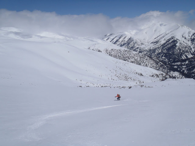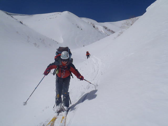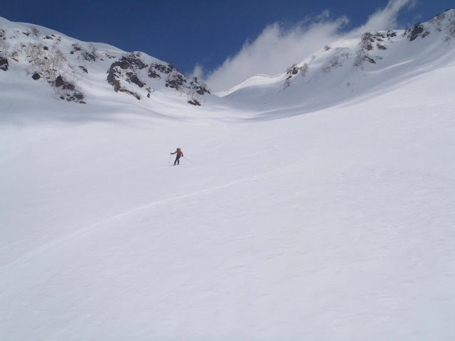 五郎カール経由で黒部五郎山頂まで登る。まずは北西面のウマ沢を標高差400m程滑降(上部はカチカチ山~下部はうっすら新雪で快適)。その後登り返して、柔らかくなった五郎カールを快適滑降。