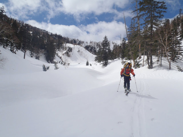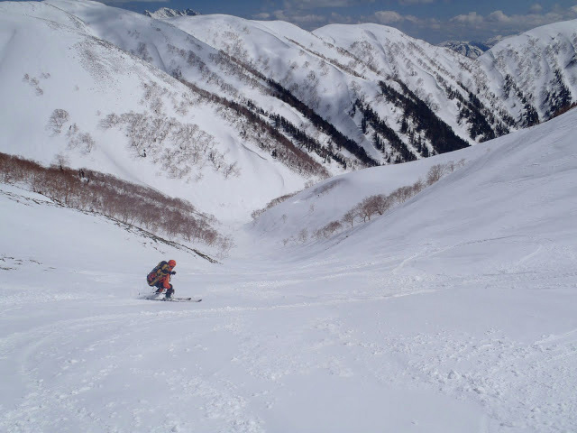 薬師沢右俣を、傾斜がある程度落ちた中間部から滑り始める(こちらの雪質チェック結果は、まあまあ安定)。快適滑降で薬師沢三俣まで。