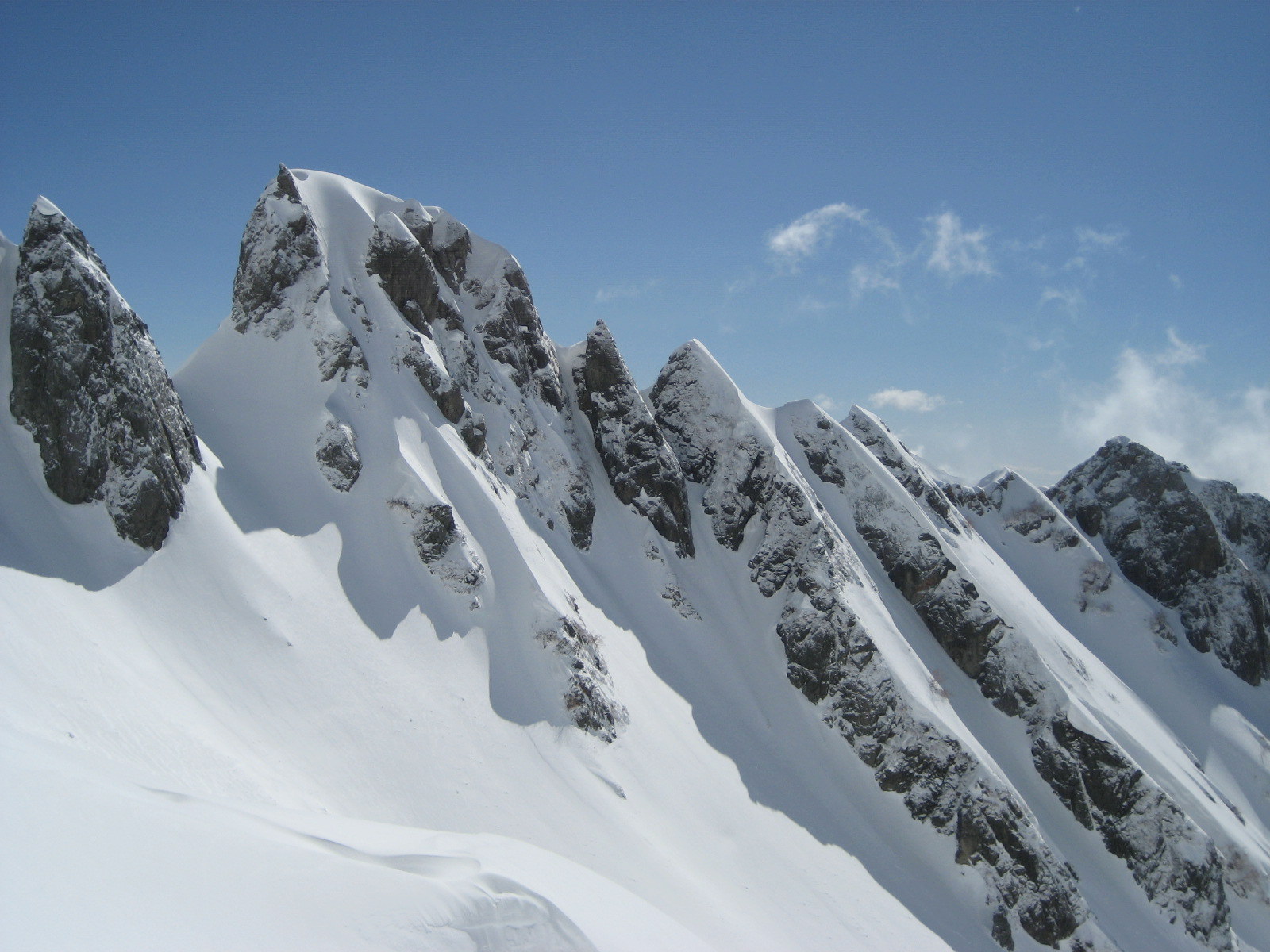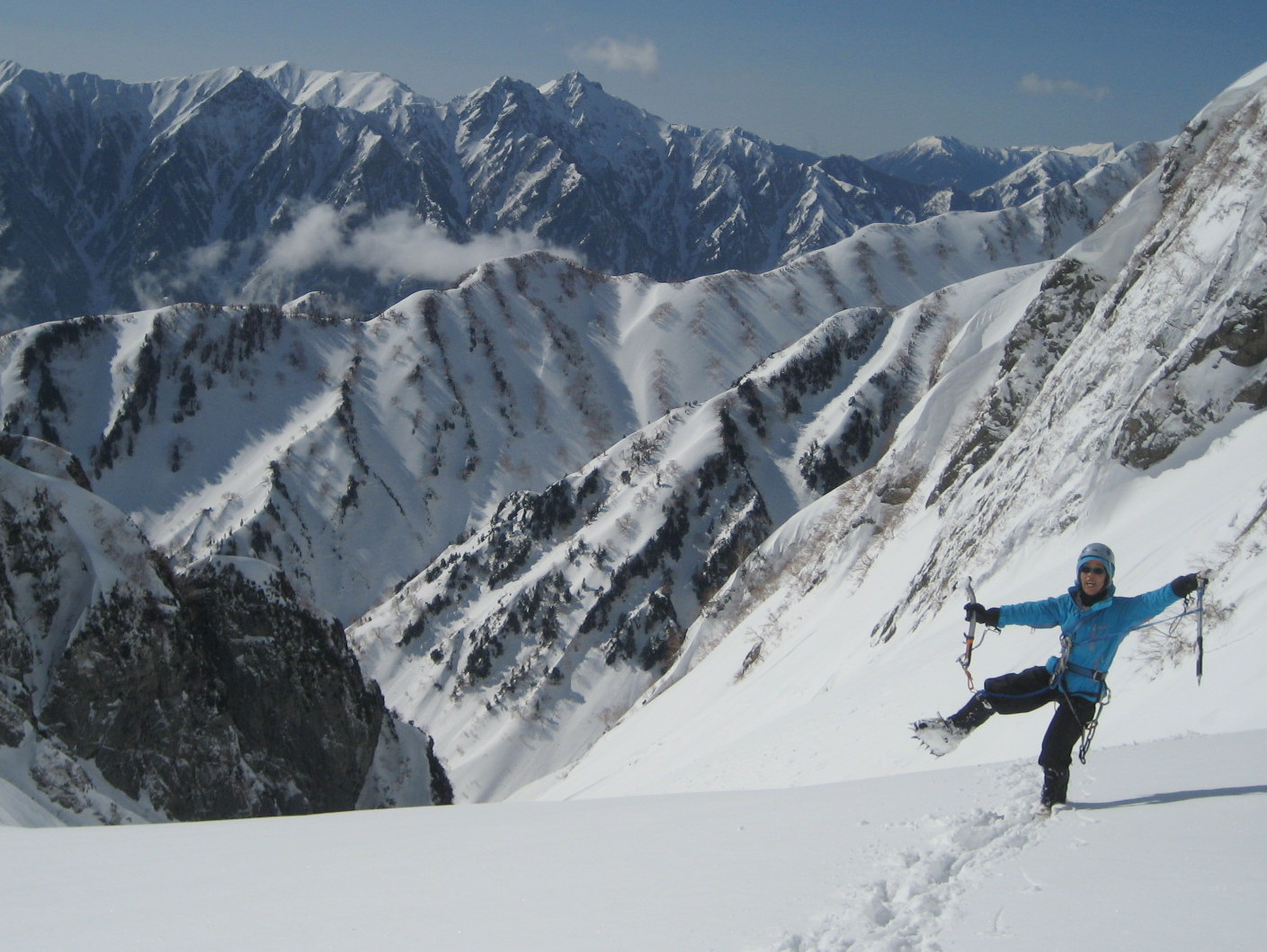 4日、3稜より八峰に取り付くPと朝挨拶を交わす。下から見た3稜は稜が判然としなかったがハシゴ谷乗越をあがるにつれ綺麗な稜線が姿を現す。T城さん単眼鏡でじっくり観察。硬い雪面の下はコシモザラ目。スノバーが利くのであろうか?八峰・源次郎だけかと思っていたが、こんなバリエーションルートもあるのだとわかり興味わく。