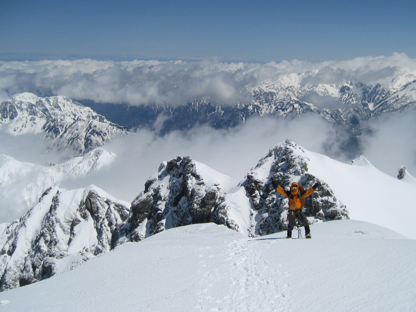 八峰のナイフリッジの稜線はノントレース。3人それぞれ景色を堪能しながらのんびりとあがる。左俣コルより本峰へ。雪が多くて山頂の祠埋まっており、多少の風はあるものの快晴、視界良好。M田初めての剱山頂で感激。