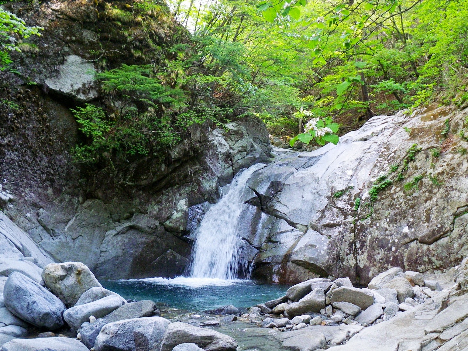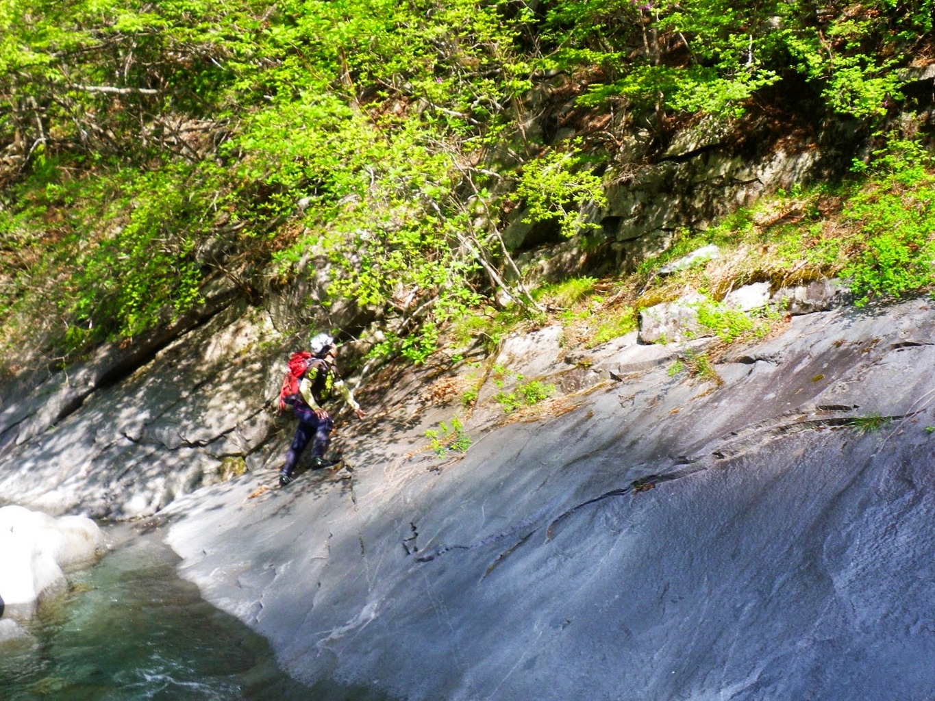 高捲きの仕組み、ルンゼやカンテっぽいところを利用して上昇し、水平移動して滝身に即して、場合によっては懸垂で落ち口に出る。お約束の最後のスラブ滝で3ピッチほどロープを出す。