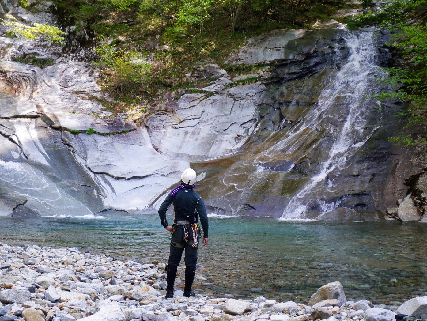 ミズシ沢出合のノール状スラブ滝では、沢の下降で懸垂下降しか手段がない場合があることを実感してもらう。そして懸垂練習。