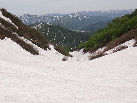 なかなか、道行山の取付きで道が見つからず、シャクナゲ・ツゲ、4級のヤブ漕ぎなんかで、1時間半のロスと疲労で山頂をも諦め、1750m付近から白沢を滑る。