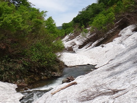 この2年ほどで、一番疲労した一日だったような感じしますが、雪・ヤブ・滝・水流・河原・新緑・草たち、それらをスキーで繋ぐ爽快と自然との同化がありました。