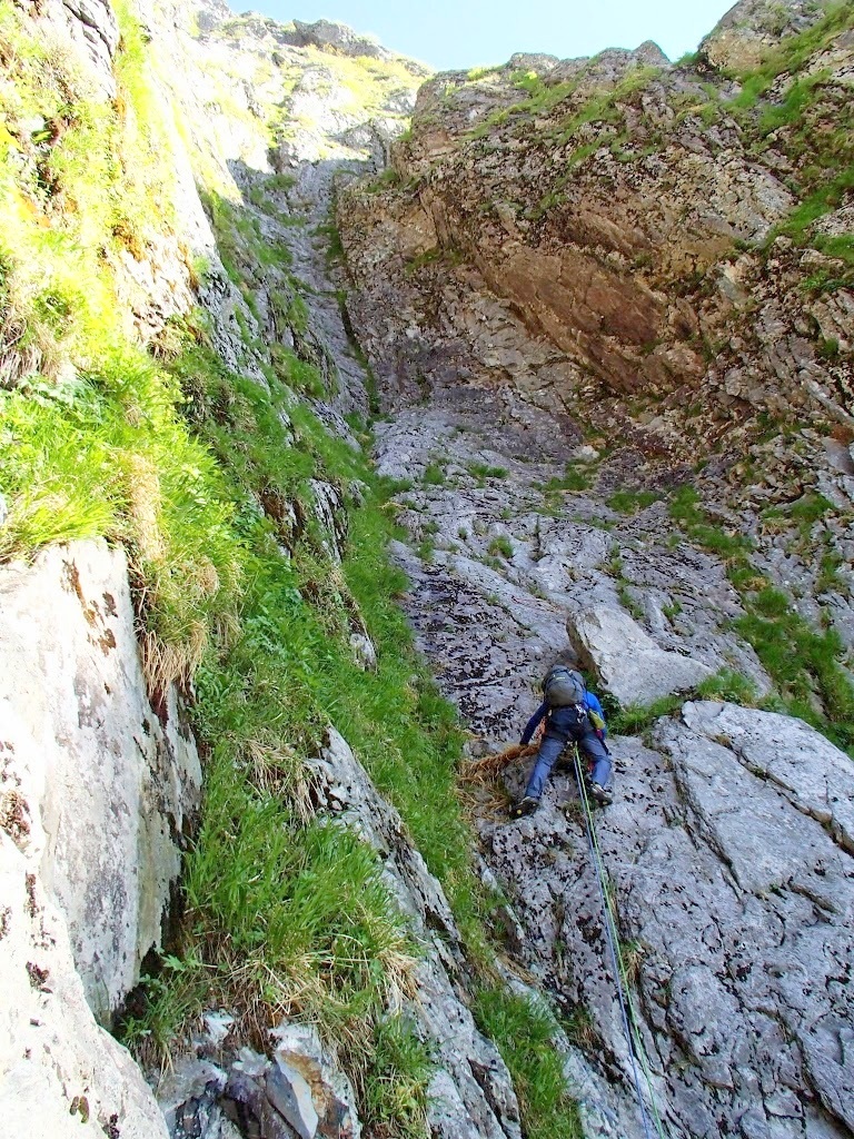 これまで日陰だったけれど、ここから陽が当って急に暑く感じる。ルート図にはピナクルが描かれてあるが、どれだかよく分からない。崩壊した?どこからだったか、後半のピッチ終了点にはペツル無し。