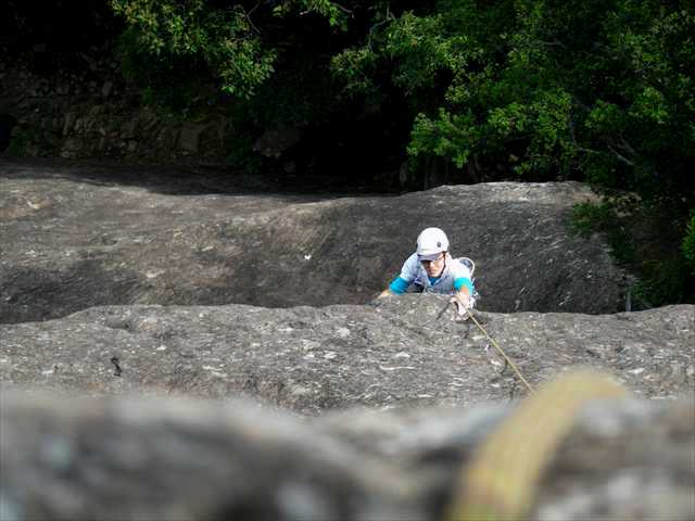 垂壁近く~(ビレイ点)~緩いフェースの小ハングを2つ3つ越え。30m弱。