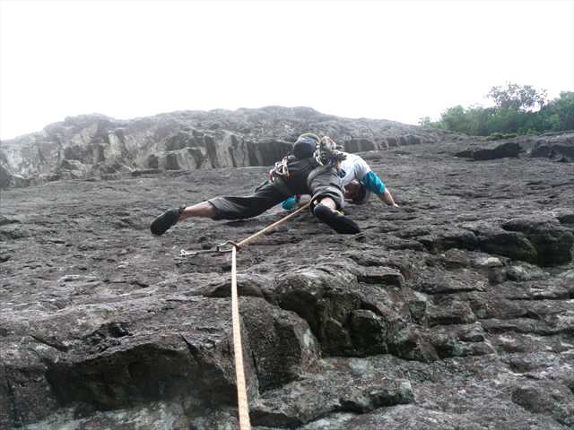 ホールド、ムーブわからずテンション(よく見たら右の方に足が置けるホールドがあった…)強度のある支点だったので、もう少し思いきりいってもよかった。