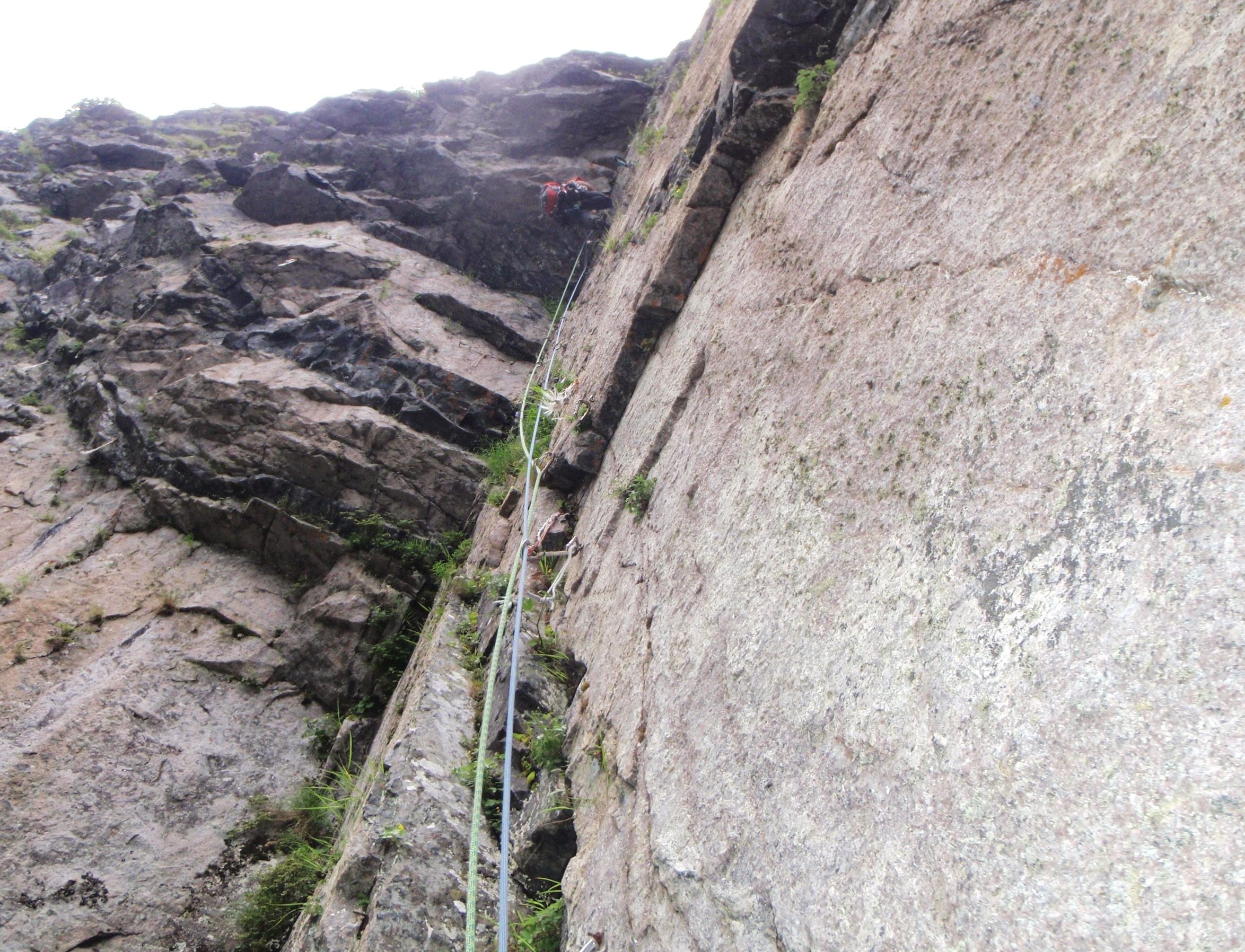 P4 40m IV A1 A山 垂直のフェースを右にトラバース、昨年よりボルトが増えており、ほぼボルト通しで進む。全ルート中唯一カム(#2)を使用して補強