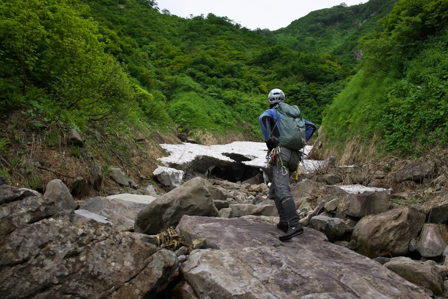 懸垂で熊穴沢の出会のすぐ下に出るものの、本流、熊穴沢ともに巨大な雪渓に埋め尽くされており、巻くにもかなり時間がかかりそうな状況。上に行ったとしてもさらに雪渓が残っていそうなので、ここでエスケープを決める。