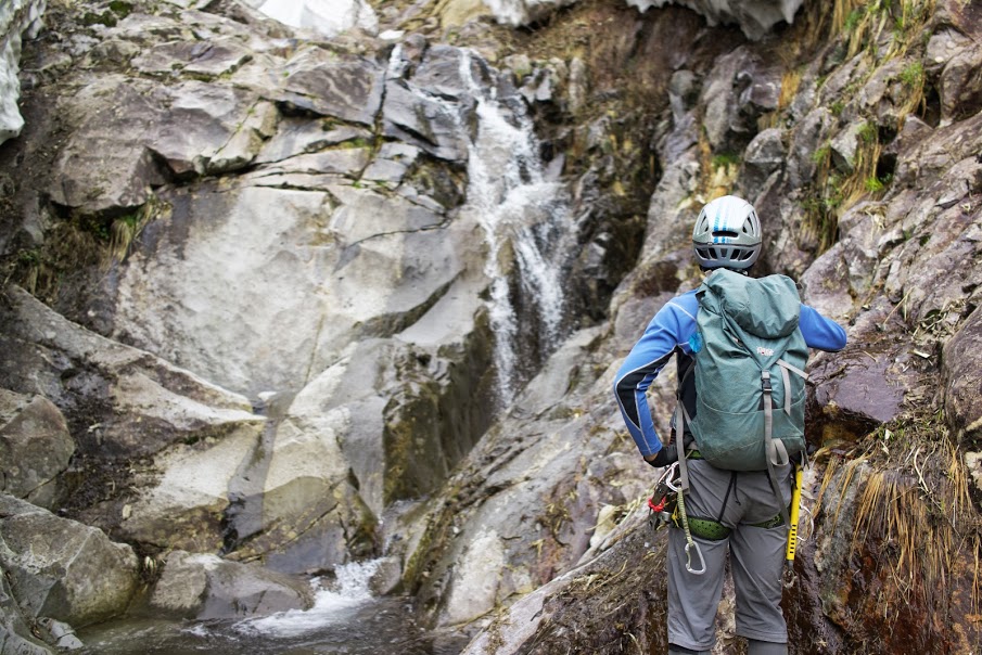 滝上に降り立つと、すぐに5mクラック状滝。ヌメヌメする右側を慎重に直登。すると半分崩壊している雪渓が現れ、すぐ脇を一人ずつ早足で駆け抜ける。が、抜けた先にさらに滝(8m滝?)があり、釜が崩壊した雪渓で埋め尽くされ、取り付けそうにない。急いで戻り、左岸を巻く。