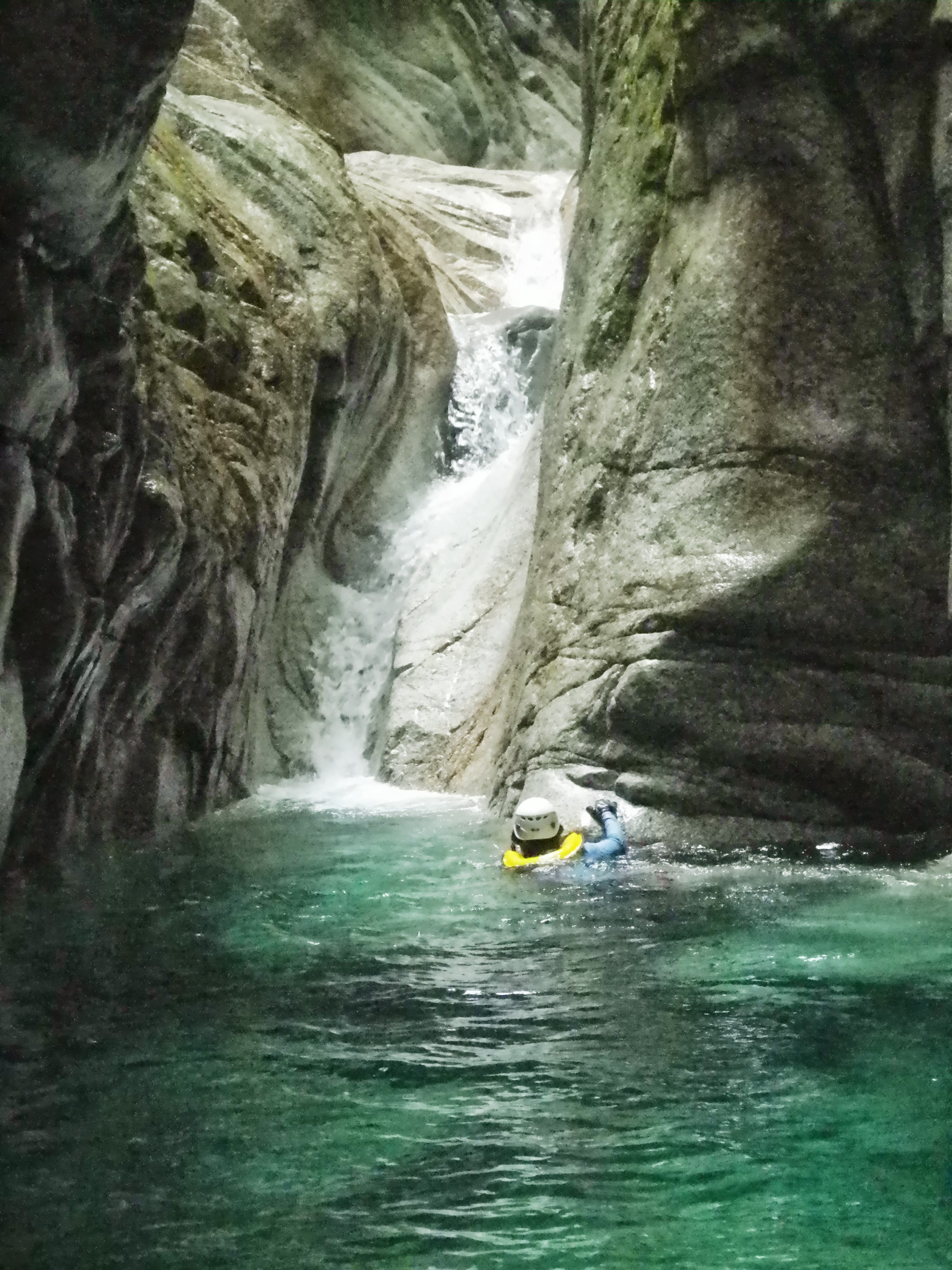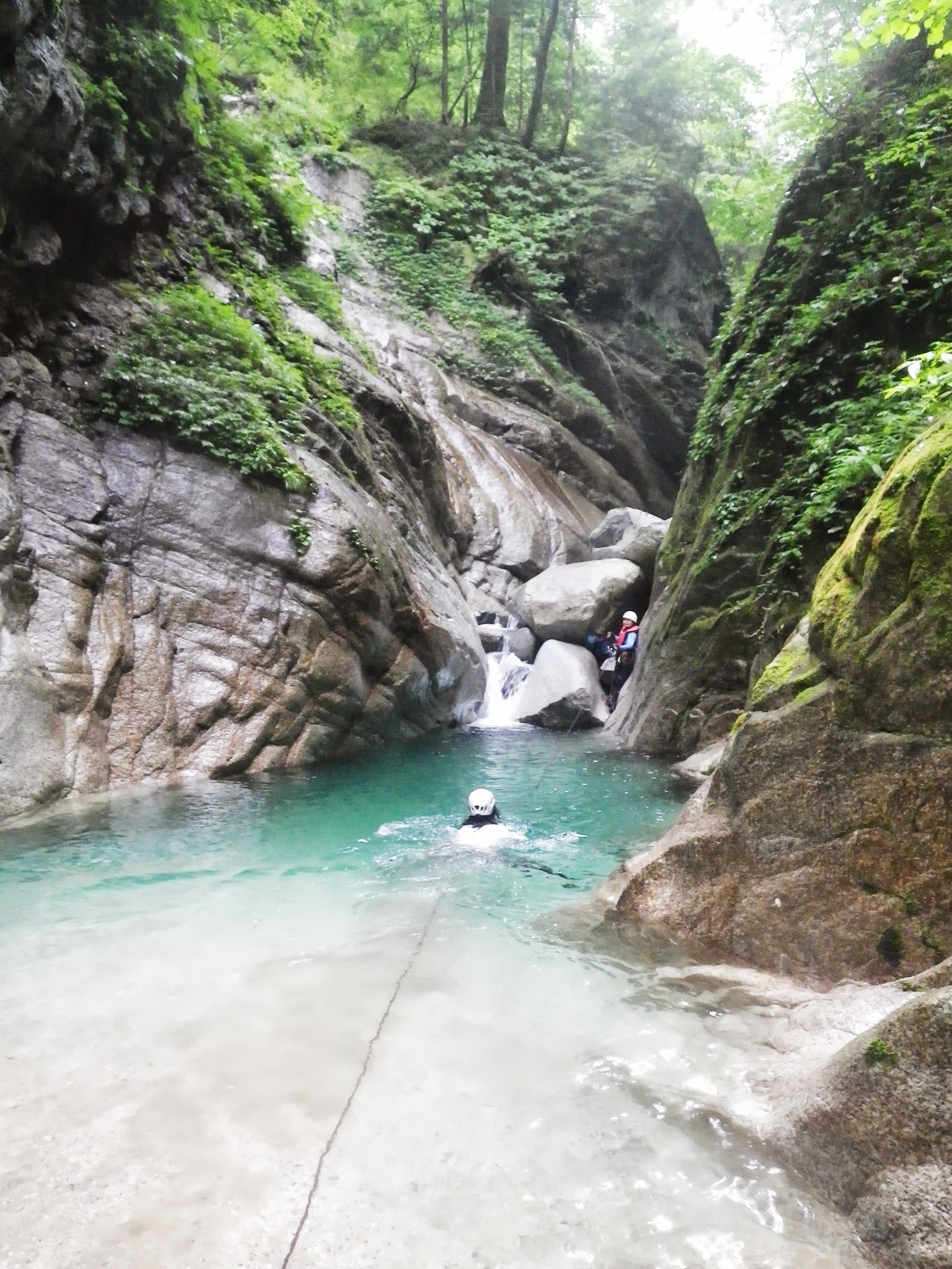 ならばとN島、一応チャレンジするが、右側泳いで近づくもつるつるで取り付けず、さっさとあきらめ左岸から巻く、50m伸ばし懸垂15mで沢床へ。