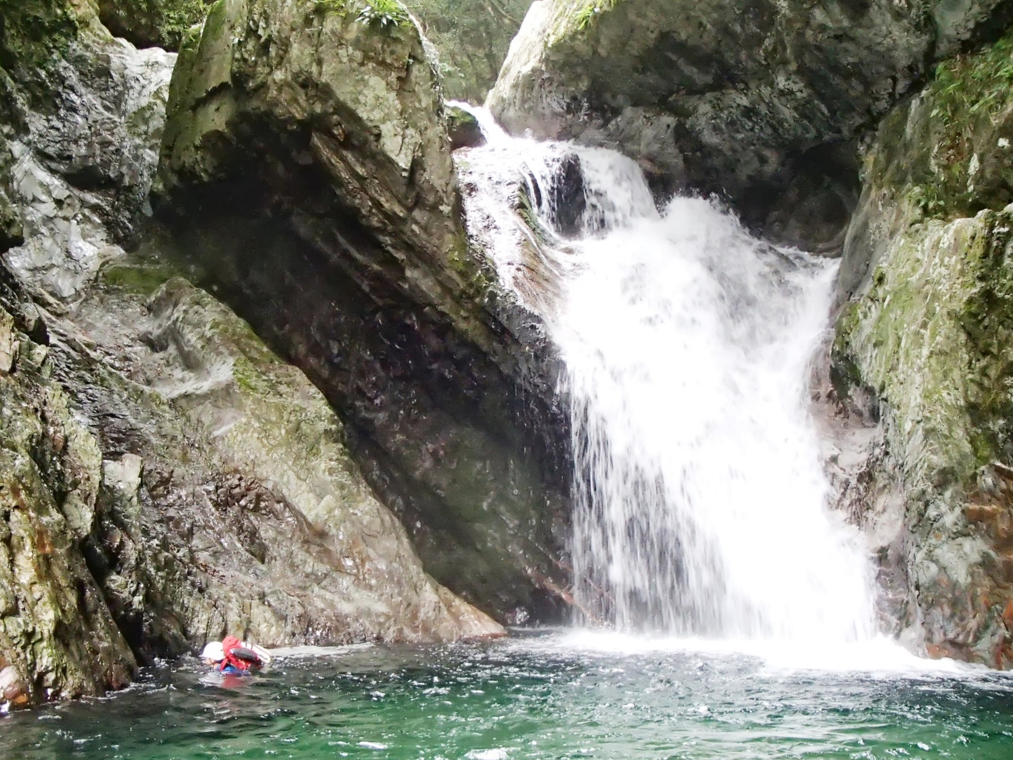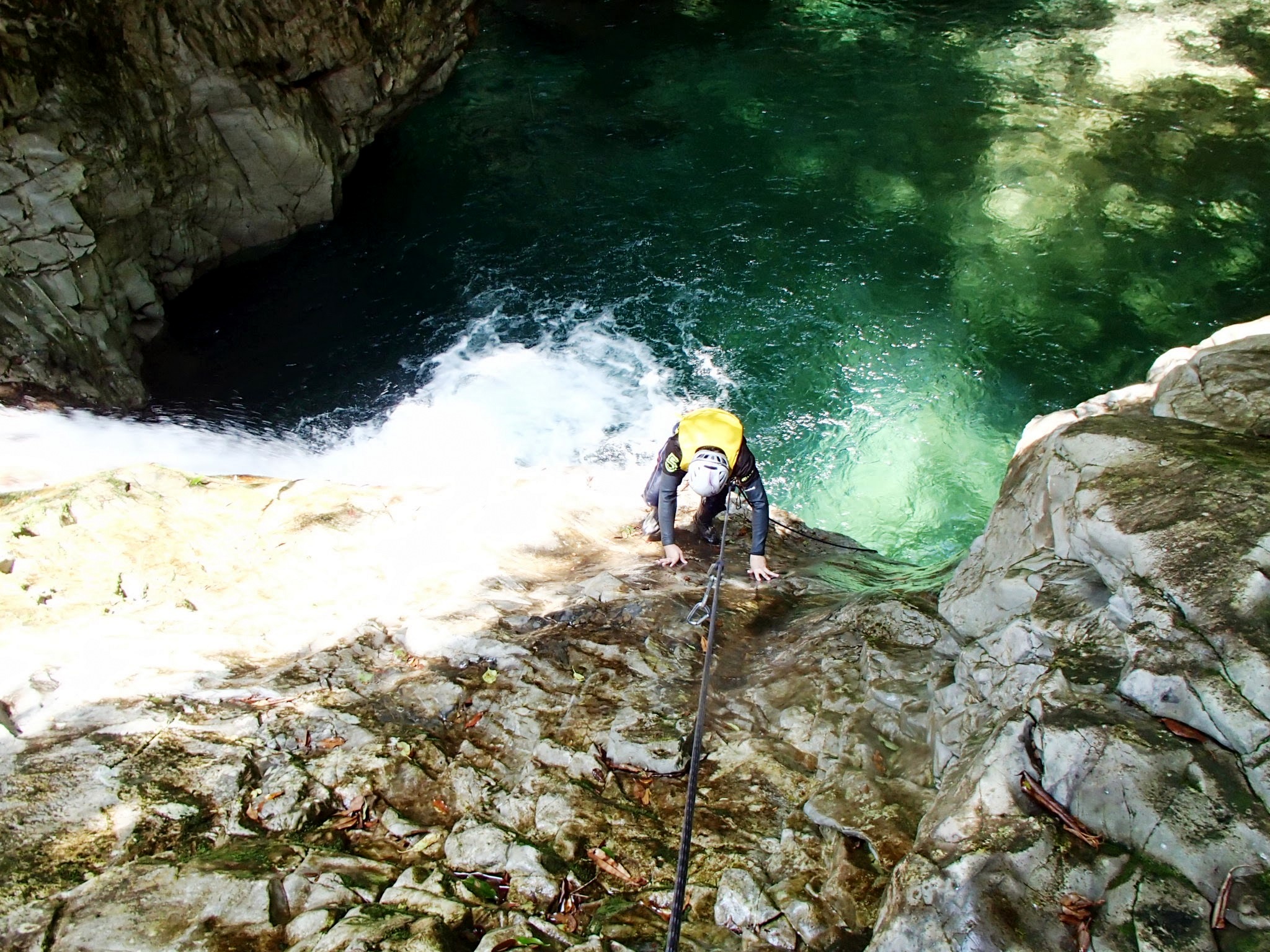 最終日も泳ぎまくり。下降するにつれ水量が増してくるので泳ぐ距離も長くなってくる。途中の滝では左岸を懸垂下降し、釜の水の中に降り立つ。