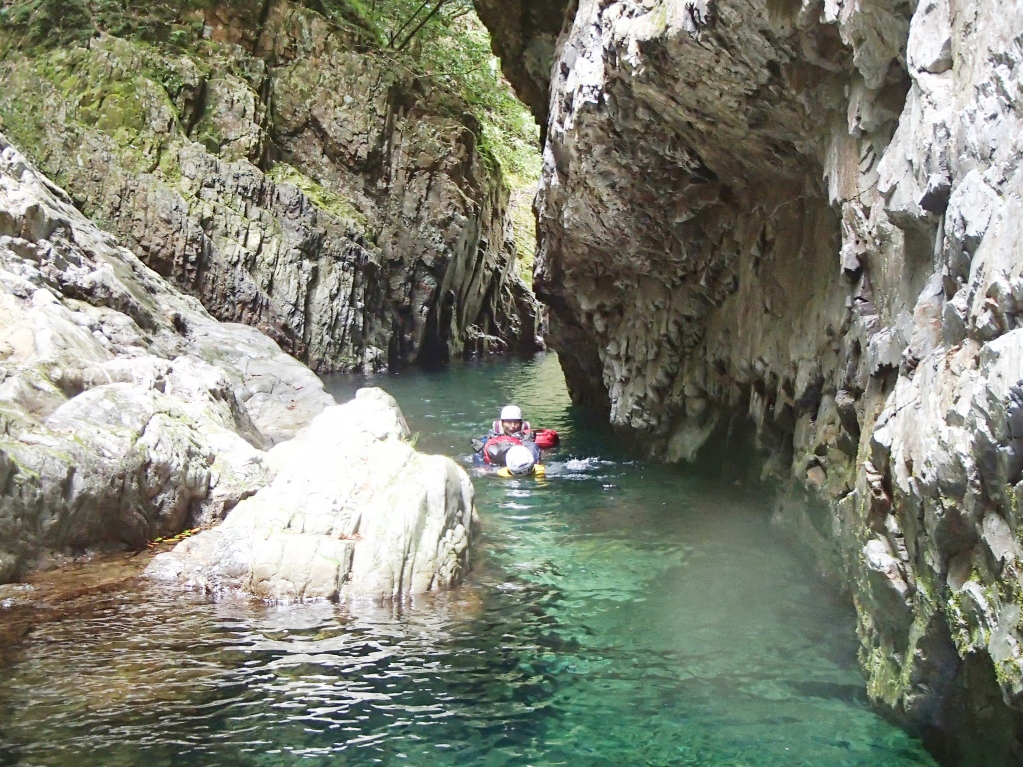鮎返滝を通過すると、下ノ廊下というゴルジュ帯が始まる。淵が連続していて、水面に浮かべたザックを浮き輪代わりにして何度も泳ぐ。短い淵もあれば、20m以上泳ぐようなところもある。ライフジャケットが大活躍。ライジャケの浮力で水の上にプカプカと浮いていられるし、水の流れはほとんど無いようなものなので、必死になって水を掻くこともない。