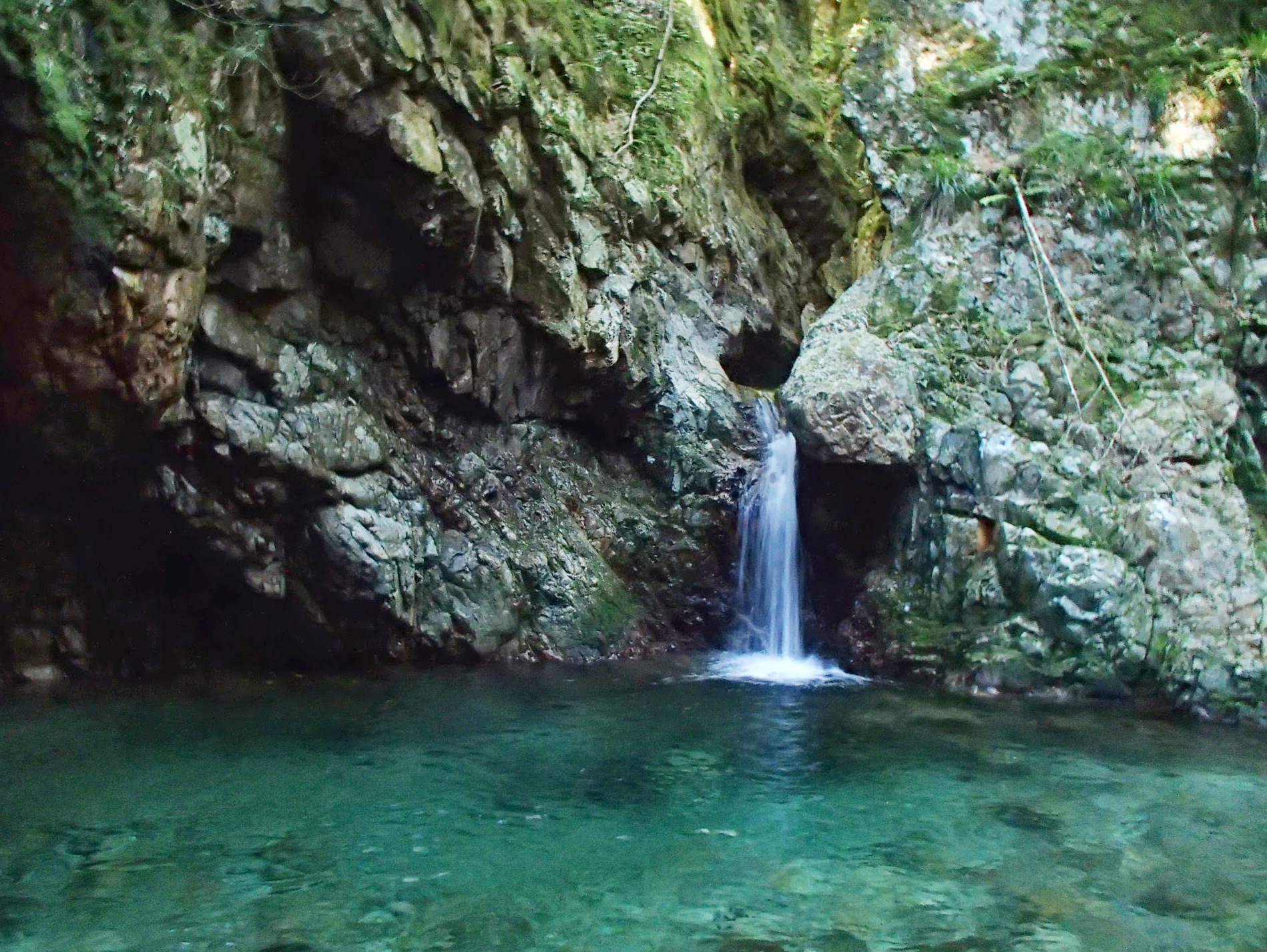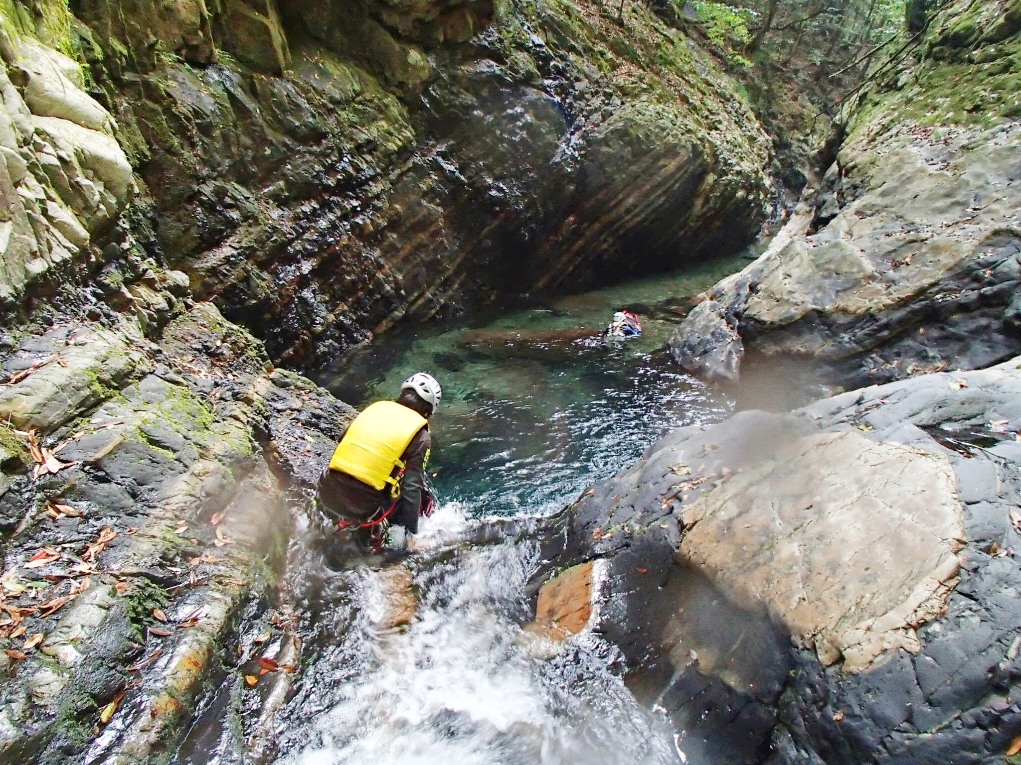 高山谷を下降していく。しばらくは顕著な滝はないが、小滝では釜にドボンと飛び込む。落ち口がスラブ状になっているところではウォータースライダーのように滑り落ちて水の中に飛び込む。地形図に記された滝では懸垂下降。