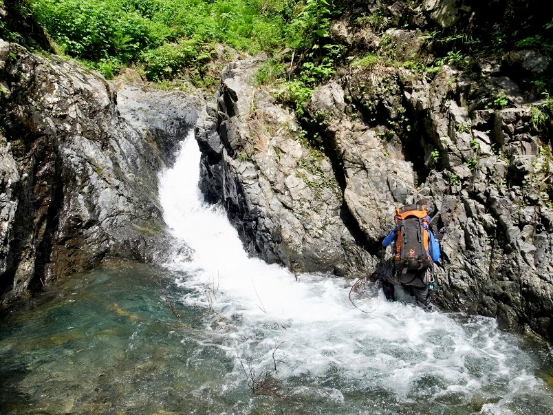 稜線から1時間ほど藪の濃い稜線を歩くと南ノ池、北ノ池の池塘に到着。下降に使ったブナ沢は滝らしい滝もほぼなく快適に下ることができた。前夜A久Pが使ったと思われる河原で幕営。