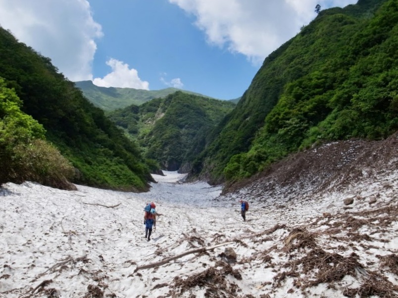 降り立った右沢は雪渓で埋め尽くされている。台地上の所に土木工事を行って無理やりタープを張った。