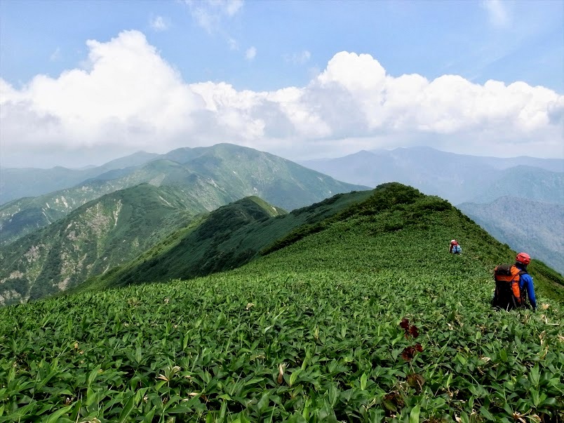 笹薮の続く稜線のため大して時間はかからないかと思っていたが、この日は強烈な暑さ。遮るものも無い稜線での行動は熱中症寸前で、予想よりも遅れて15:30に小穂口の頭に到着。ここからはひたすら下るだけだ。