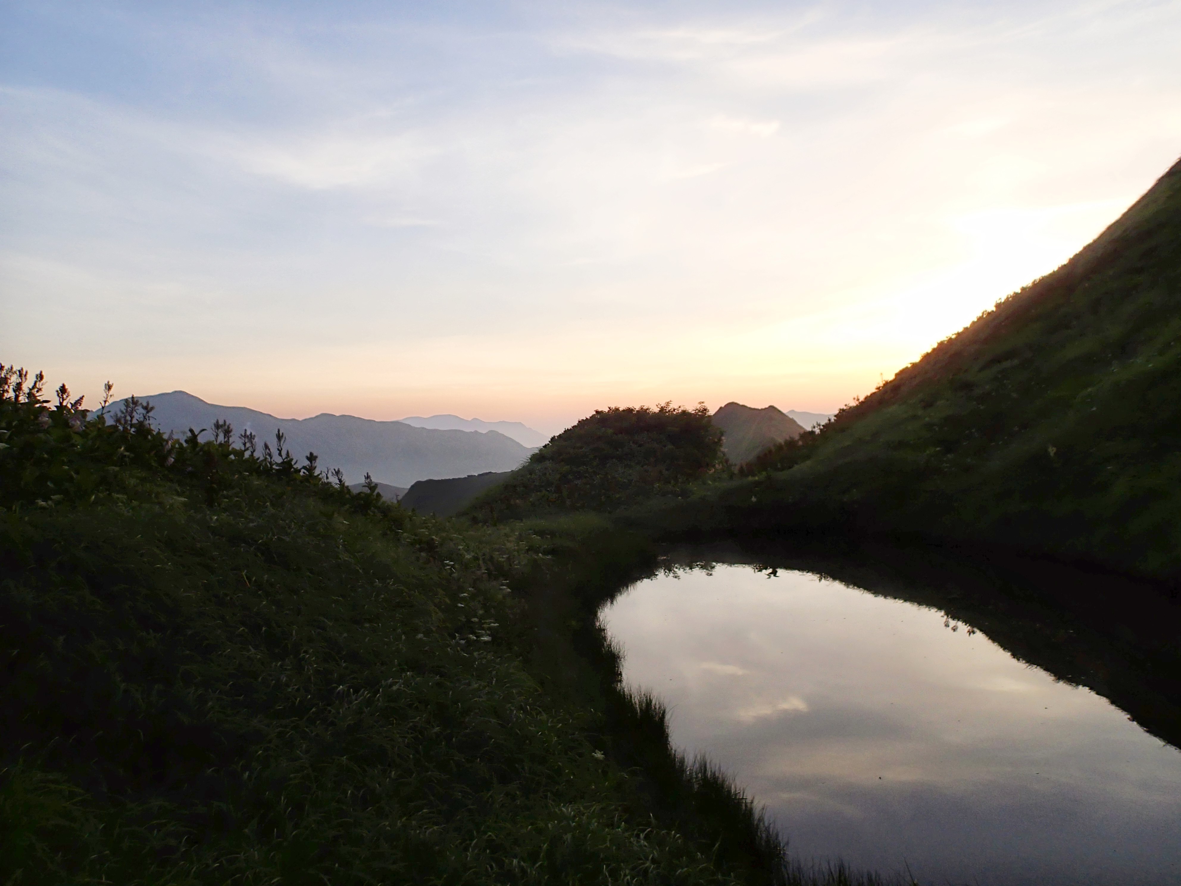 詰め上がった稜線上から見える池塘にてBP、素敵な場所でした。