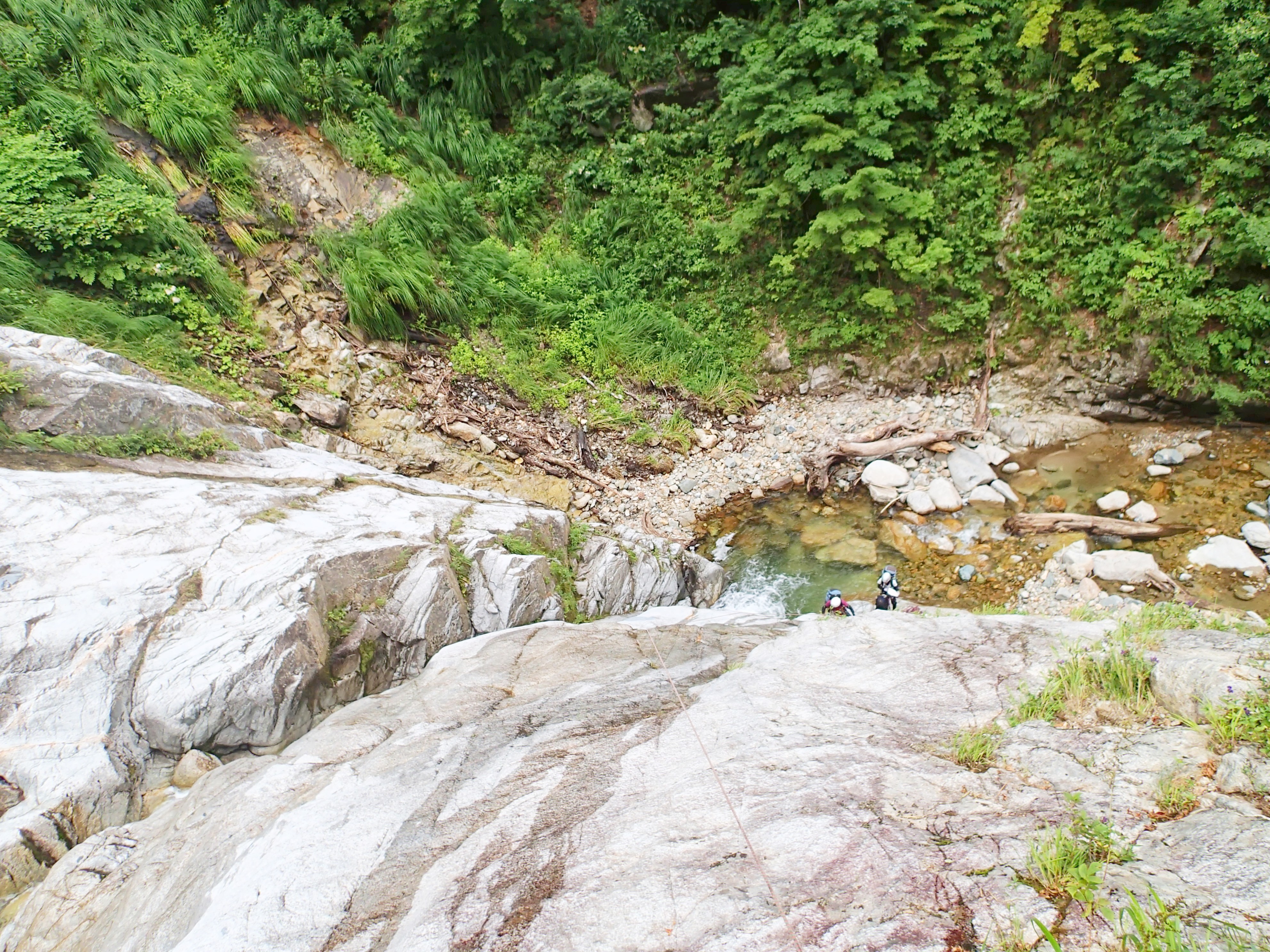 沢に降りてからもブリッジがあったり、ブロックが有ったり。小滝が続き、もう何もなさそうと思っていたら、沢が左に曲がった先に黒いヌメった15m滝。空身で取り付き、中間部のガバホールドの岩がずりっと動いて冷や汗。ここは全員荷揚げした。