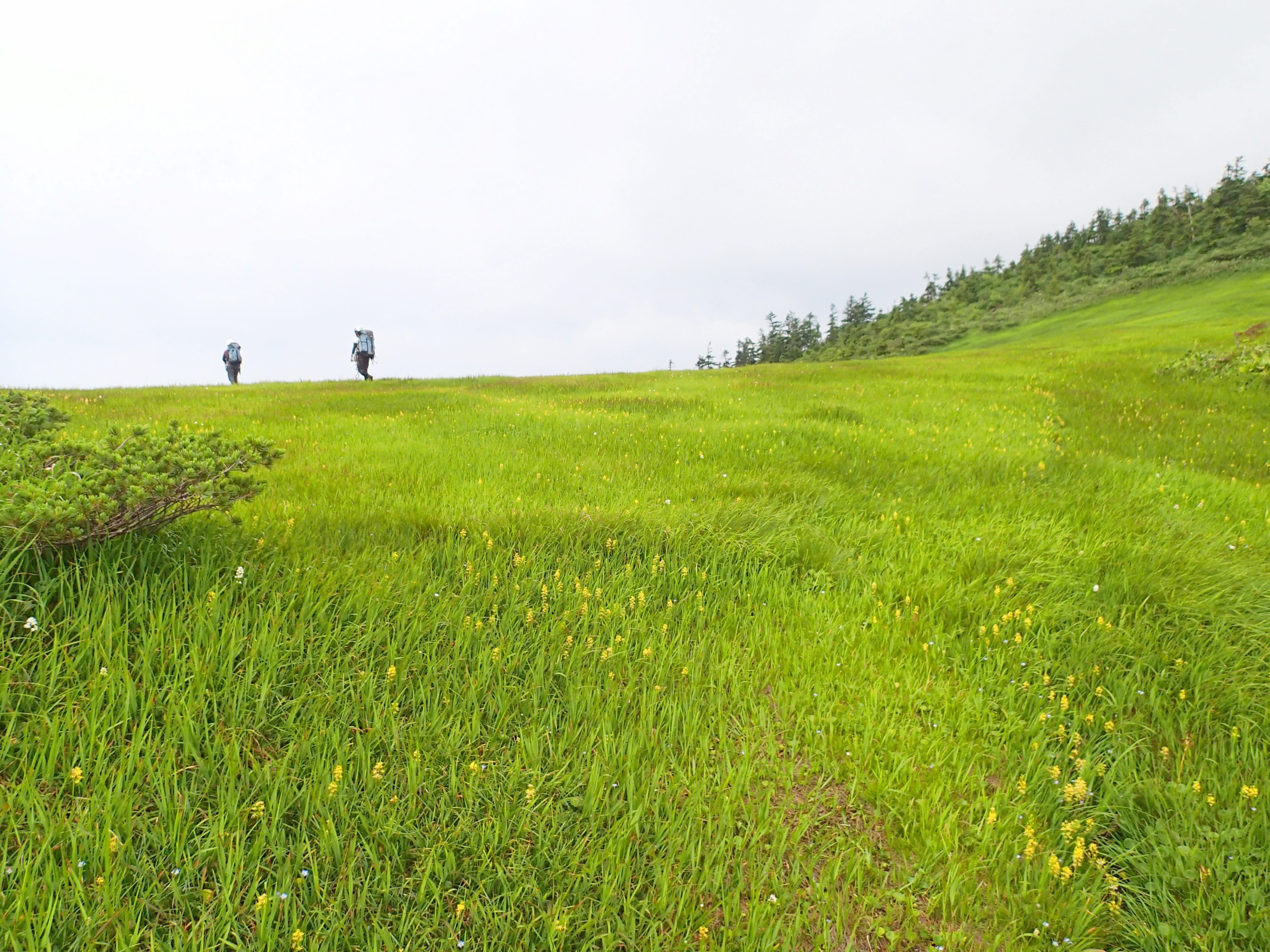 詰め上がった稜線は草原に池塘があるとても気持ちの良い所でした。ゆっくりのんびり休憩したかったけれど意外にも風が冷たい。笹薮を漕ぐこと5分くらいで窪状になり銅ノ沢の下降。