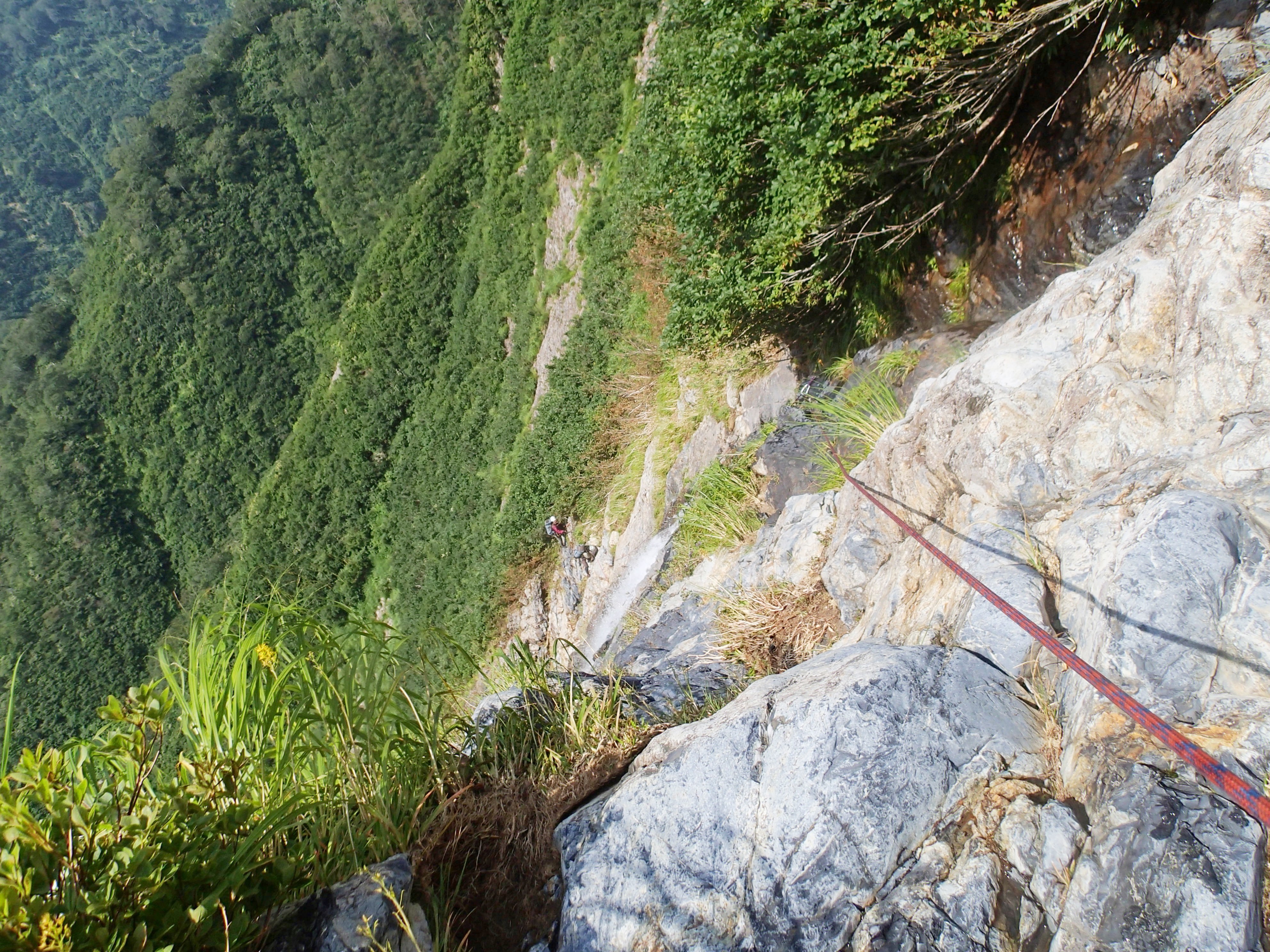 文殊沢出合先の魚止め滝の連瀑は左岸から巻く、ルンゼから上がり、トラバースに念のためロープ2ピッチ、懸垂25mで沢床へ。