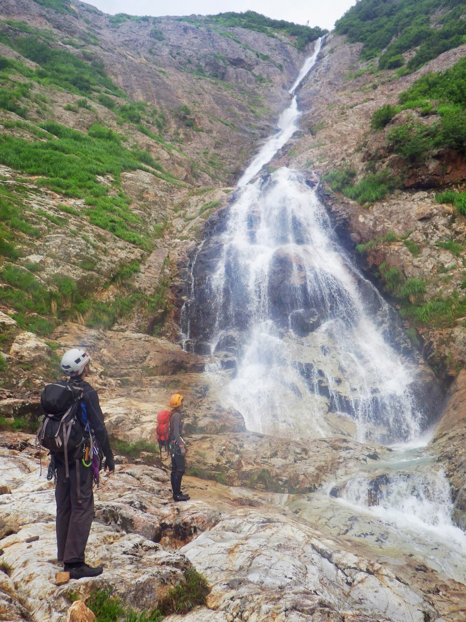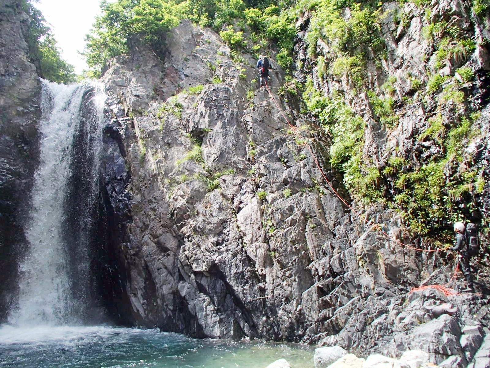 出だしはブッシュ帯と大滝左側に広がる岩場の間を登って行き、途中から大滝に向けて右にトラバースしていく。今回の大滝登はんでは、このトラバースが一番怖いところかも。50mロープをめいっぱい伸ばした辺りで、M中さんが落口手前のブッシュ帯にたどり着いたので、そこでピッチを切る。2人目、3人目はロープにアッセンダーを付けて続き、最後の4人目はビレイされて登る。
