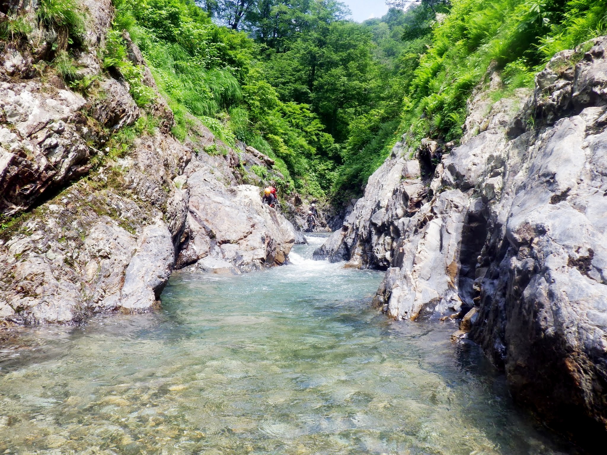 本谷を進んで行くとすぐに剣ヶ倉土合というゴルジュ帯に入る。その剣ヶ倉土合の序盤で、ヒトマタギが現れる。ゴルジュが狭くなっているところで、文字通り両足を広げて両岸に立つことができる。各自記念撮影する。