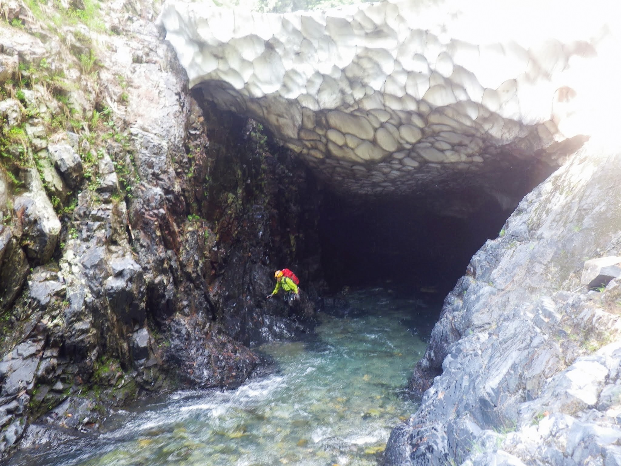 ハト平の平坦地は残雪で覆われていたため遡行を続ける。すぐに出てくる雪渓の上を歩き、深沢出合で藪に入って懸垂下降で次の雪渓上に降りる。そこから狭いゴルジュとなるが、急に水が濁りだす。先へ進むと、やはり崩壊中の雪渓がギッシリとゴルジュ内に詰まっている。この時点でスノーブリッジの数を数えるのはやめた。氷水に浸ったり、雪渓と壁のわずかな隙間を抜けたりと、悪戦苦闘しながらなんとかゴルジュ帯を抜ける。