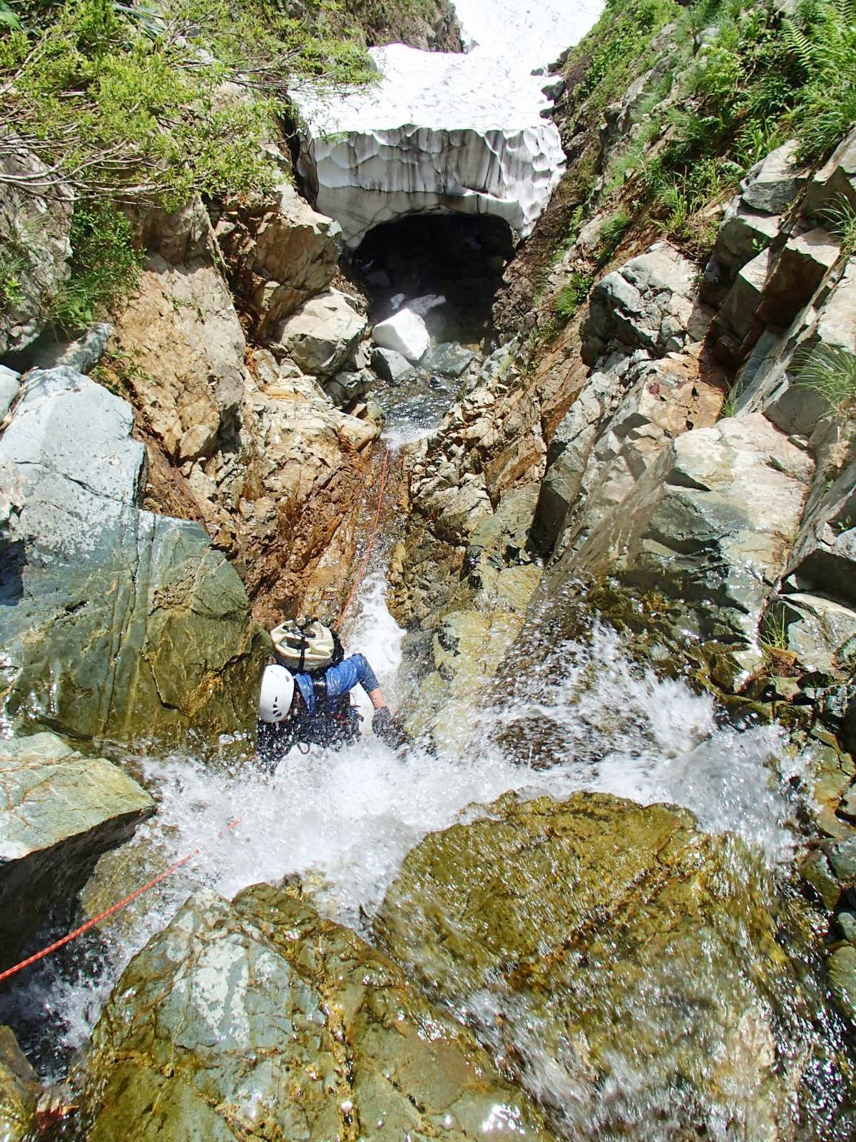 4:00起床、6:00出発。朝一のゴルジュ帯はやっぱり雪渓がビッシリ。適宜、潜ったり、藪から巻いて懸垂下降で下りたりして抜ける。しばらくすると雪渓が消えて、快適な小滝群が始まる。これでようやく雪渓とおさらばかと思いきや、人参滝手前でまたしても巨大な雪渓。この辺になると水流が少なく、下を潜れなくなってくるので、やむなく雪渓上に乗ろうとするが、取りつこうとすると雪渓が崩壊して冷や汗もの。仕方がないので、手前の藪からロープ3P→藪漕ぎ→懸垂下降で巻く