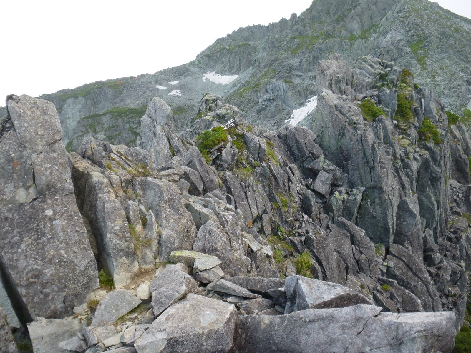 下からは見えなかった雪渓の上を巻き、ザレたルンゼ登りを避けて、手前の支尾根から直接ゴジラ岩の手前に出るルートを選ぶ。結果的にはこれが正解だったようだ。