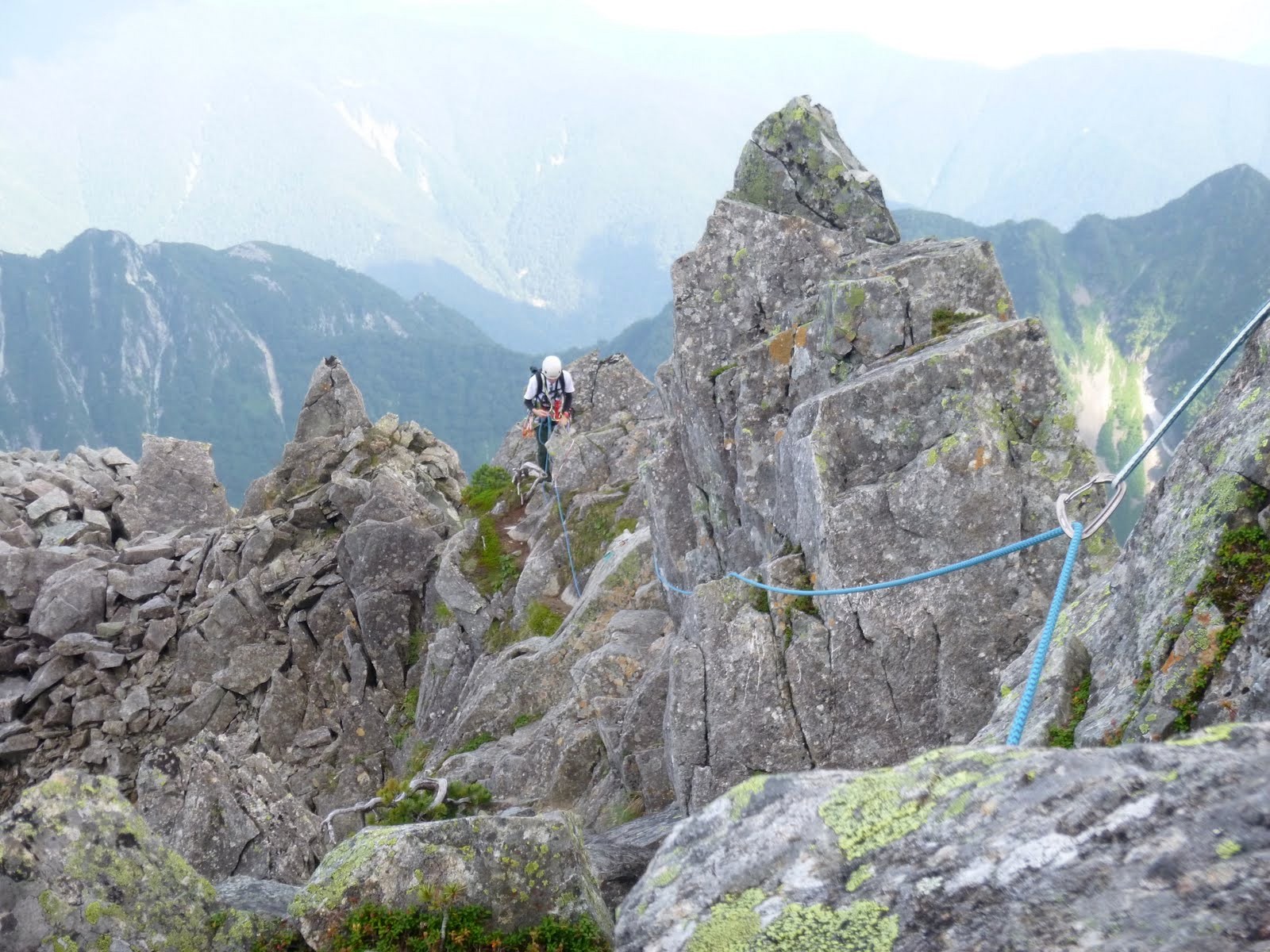 尖塔が並ぶ「ゴジラの背」ではS原リードで2Pビレイしてもらう。1箇所だけ短い垂壁の登りがあり、軽登山靴で少し緊張する。東稜のコルへの下降約10mはクライムダウンも可能だが、せっかくロープと支点があるので懸垂下降。