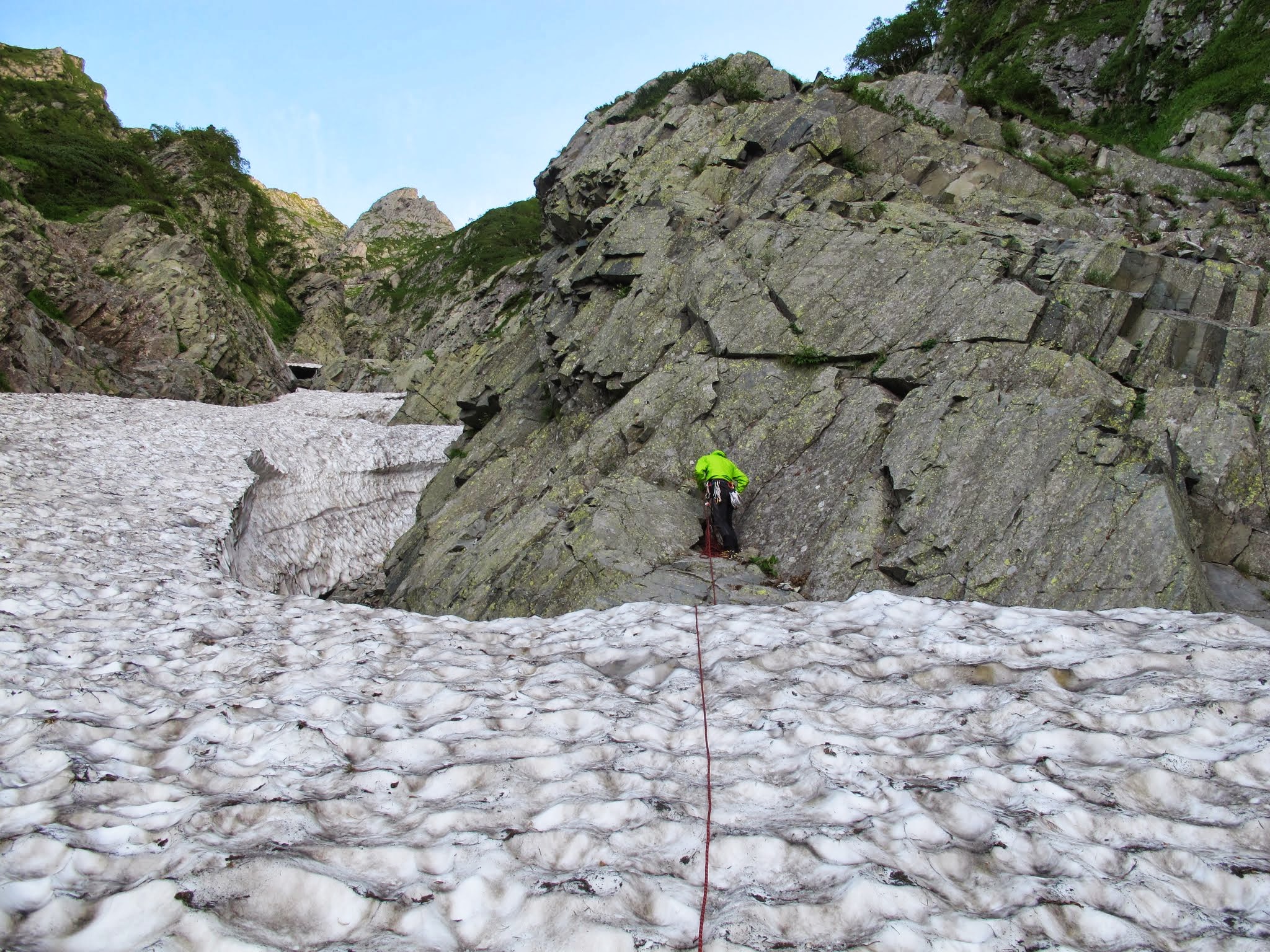 2日前の偵察時に確認した取付き点のうち既に1箇所は猛暑のためか既に危険な状態になっている。残る箇所も雪渓の厚みこそあるが辛うじて尾根に繋がっている状態。シュルンドは深く奥からザバザバと水音がしており怖い。前日の明神岳主稜の明るさとは打って変わって陰惨な印象である。ネットで見た人の山行記録ではこの取付きは「ニセ入り口」とあった。