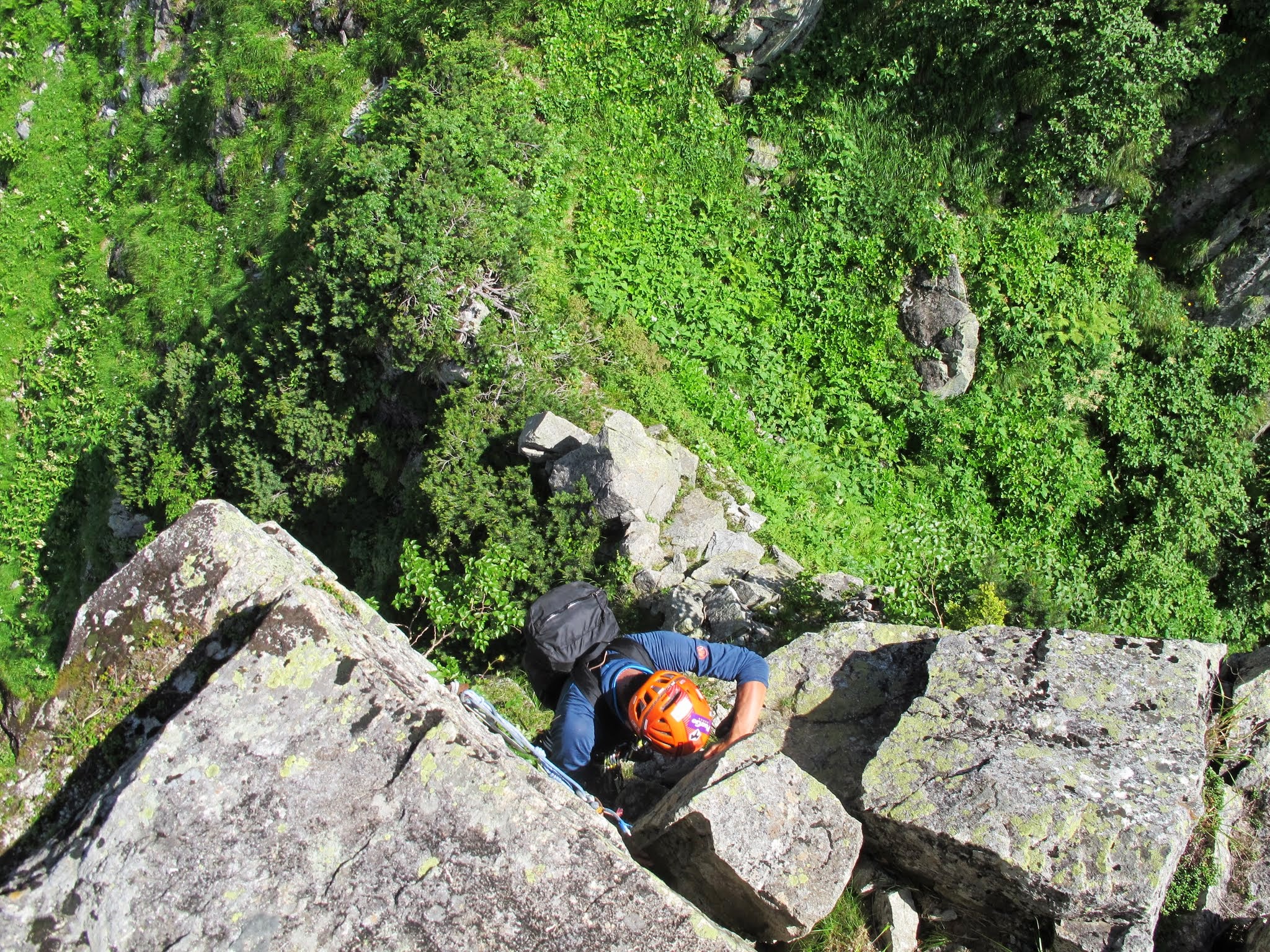 凹角を直上し上部でカムを決めて乗越したところにあったピナクルでピッチを切る。2、3ピッチ目と繋ぎコブの頂上へあがる。一番上の大きなピナクルにある懸垂支点を利用したくなるが、距離を考慮して、先にある中段の支点を選択して下降。これが正解で鞍部にドンピシャで降りられた。