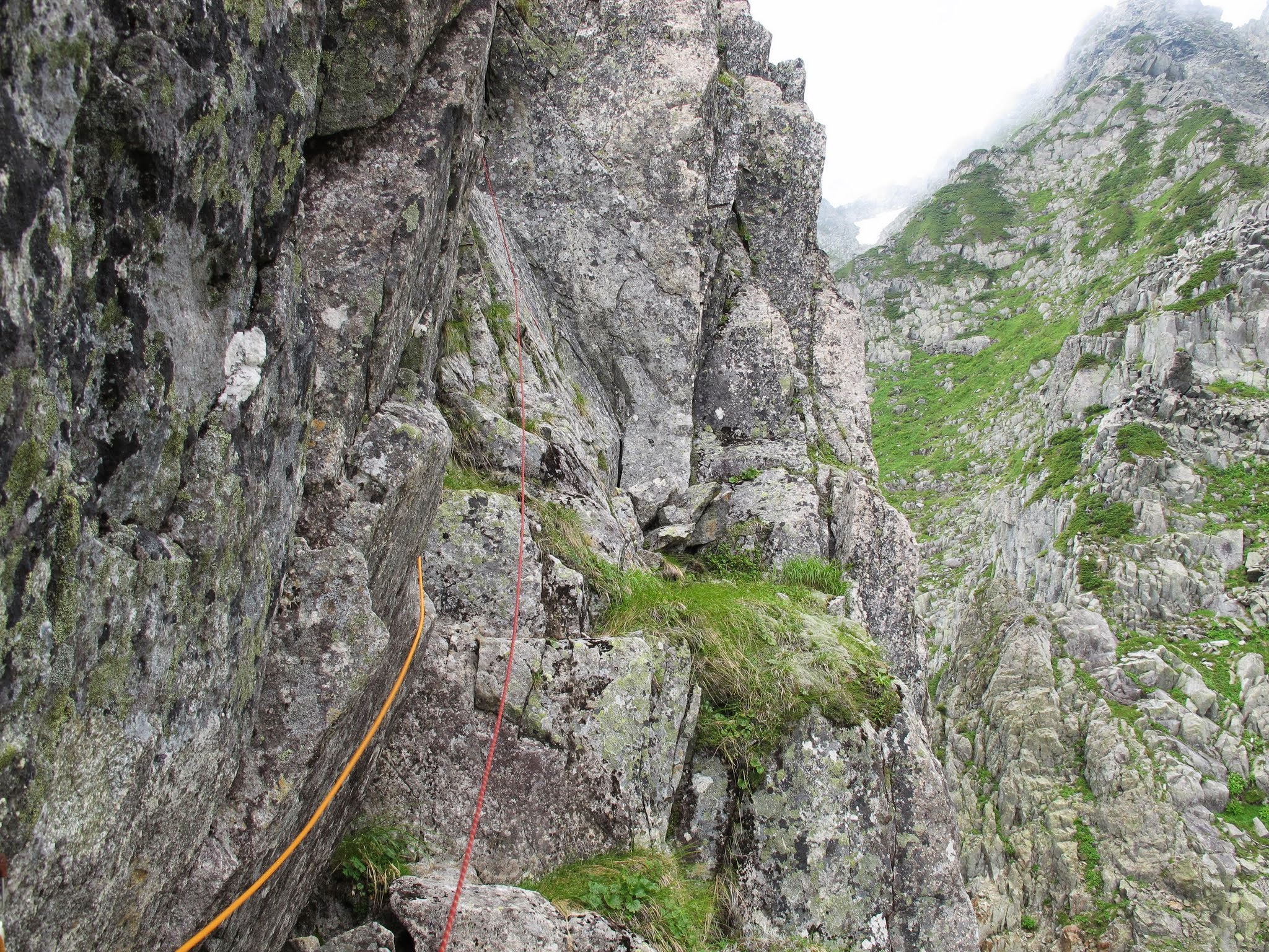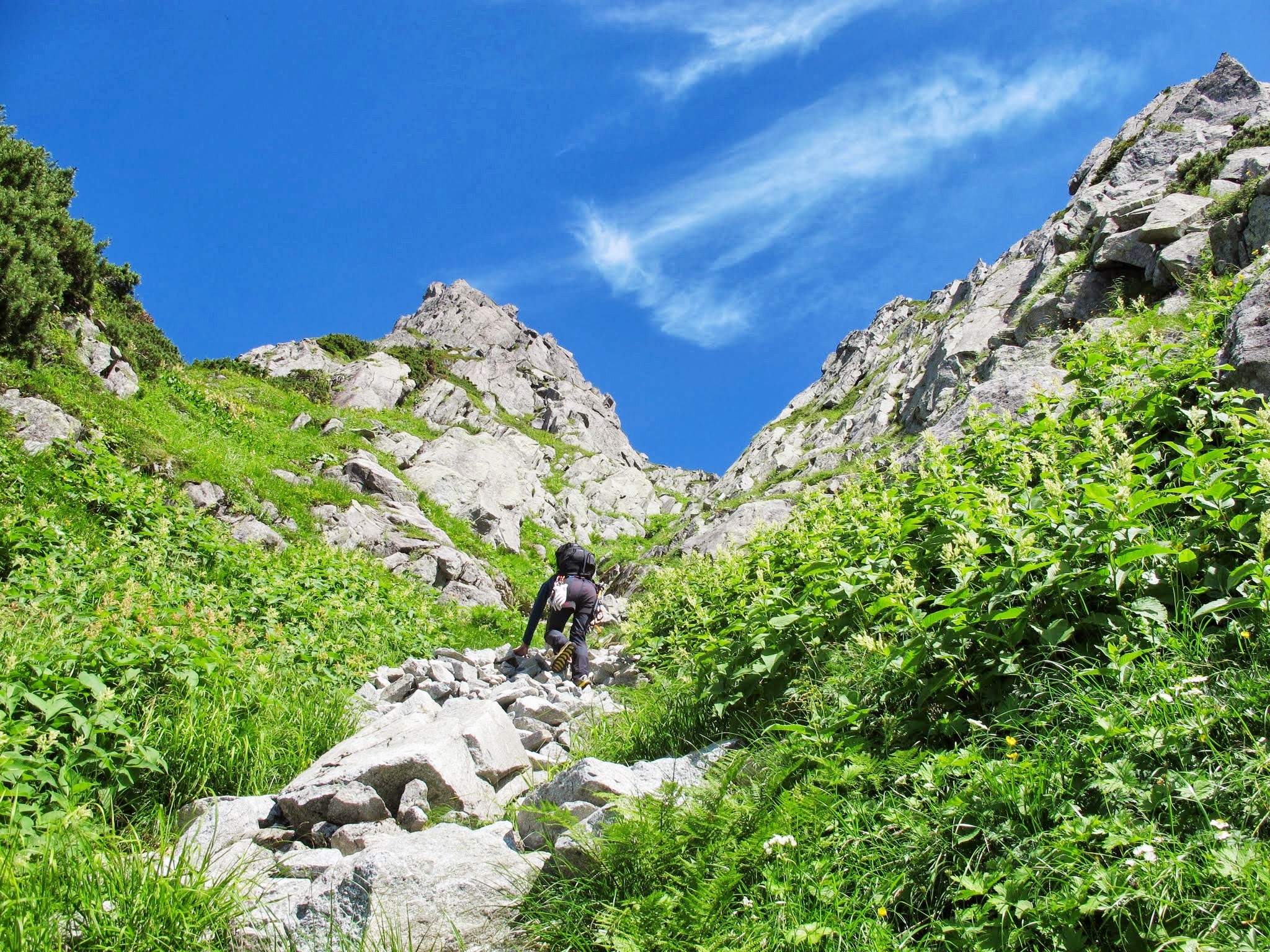 「ニセ入り口」と記録のあっただけのことはあり、ルンゼ内は浮石だらけで非常に悪い。暫く慎重に登ると、やがて安定した草付ルンゼになる。ハイマツ帯と草付ルンゼを交互に抜けてコブ尾根稜線に上がる。稜線上には一箇所幕営適地があるが、やはり陰惨な印象で「幕営」というより「墓営」といった趣きである。