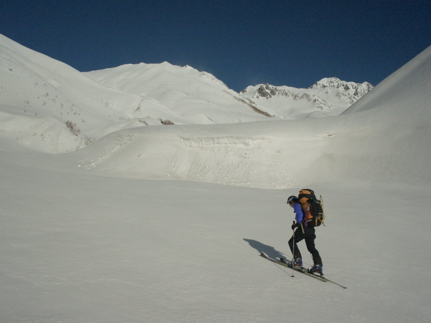 出だしはアイスバーンのため、アイゼンで100mほど降り、雪が乗ってきた時点でピットを掘るが、やはり凍結融解層の上のなじみが良くない。上に載る雪は厚いところで70cmほど。確信が持てないため、更に標高100mほどアイゼンでそっと下降。傾斜が落ちたところからスキーを履く。国見谷は広く、この時期スキーに絶好。ザラメを快適に滑る。小滝を左から巻き、湯川谷本流に合流、M平さんの楽しげなシュプールが目に入る。