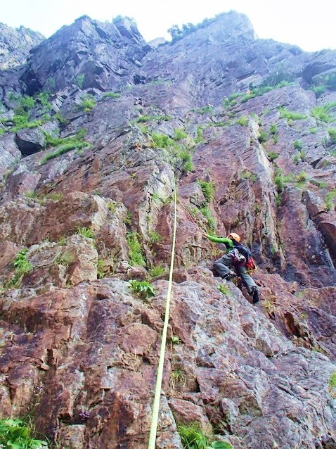 ボロボロのフレーク状のフェースを大股開きでトラバース。Mちゃんはイタリア・ナポリが入っているので足が長い。