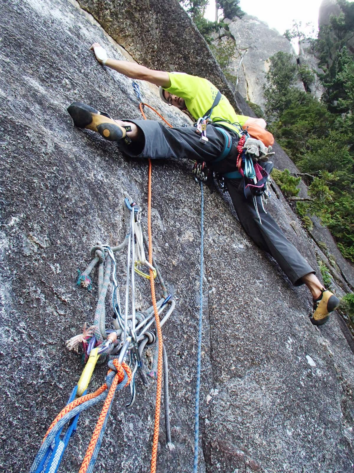 このピッチが今回ある意味最も大変だった。ビレイ点のテラスから小さな岩を一つ乗っ越しながら左トラバースしていく。その小さな岩のてっぺんに立つと壁の中に打たれたリングボルトにランナーが取れる。