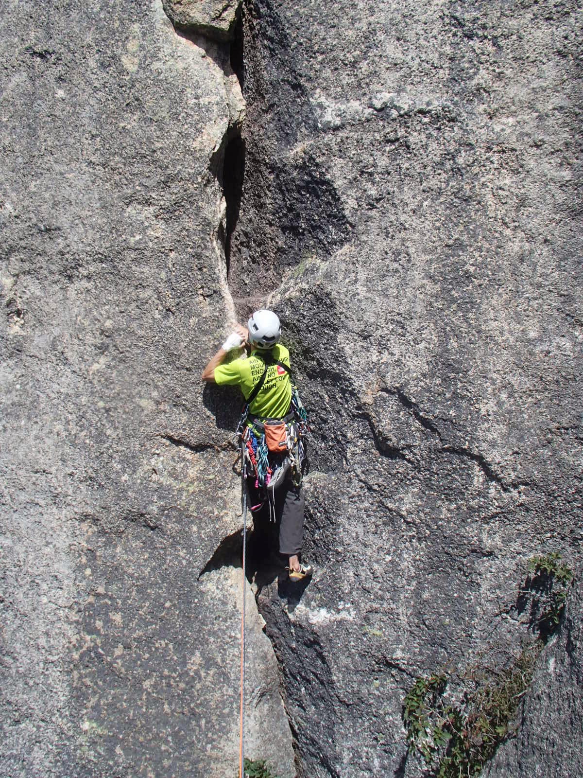 最初のガバ地帯からマントル気味にスラブへ。スラブを登ると再び樹木がある。ルート図ではここでピッチを切るようだが、短いのでそのまま登ることにした。いくつかある樹木をたどって右上すると、凹角に至る。凹角の左側の岩にハンドサイズのクラックが走っている。白クマのコル直下の5.9クラックのようだ。手持ちのカムが足りなそうなので、ここでピッチを切る。