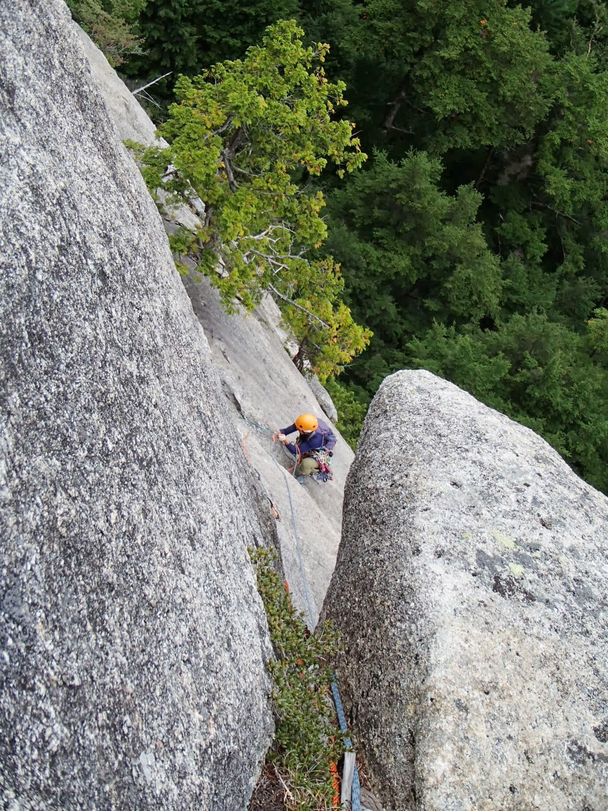 そこを抜けると凹角が現れる。この凹角にカムをきめ、凹角の右側のスラブに一つ打たれたリングボルトにランナーを取りつつ登り、左上の樹木でピッチを切る。このピッチはチョンボせずに登れた。