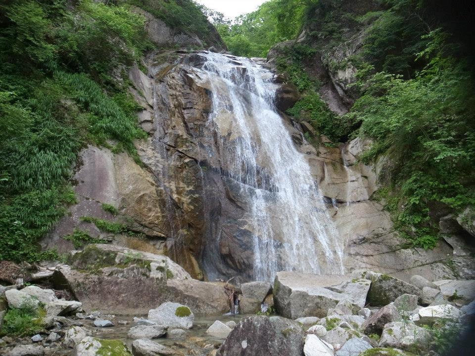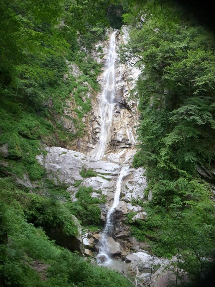 以降は渓も穏やかになり核心部が終わる。前方には七丈ノ滝130mが望め、見上げるような高さから水を落としている。
