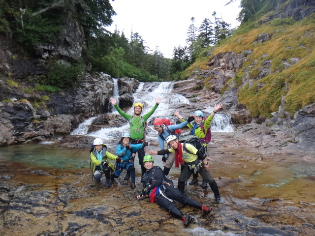 入渓してすぐに滝が続くが、どれも直登が容易か巻道が明瞭なものばかり。全く難しいところはなく、順調に進む。天気はというと、晴れ間が差したり強く降ったり、相変わらず忙しい。